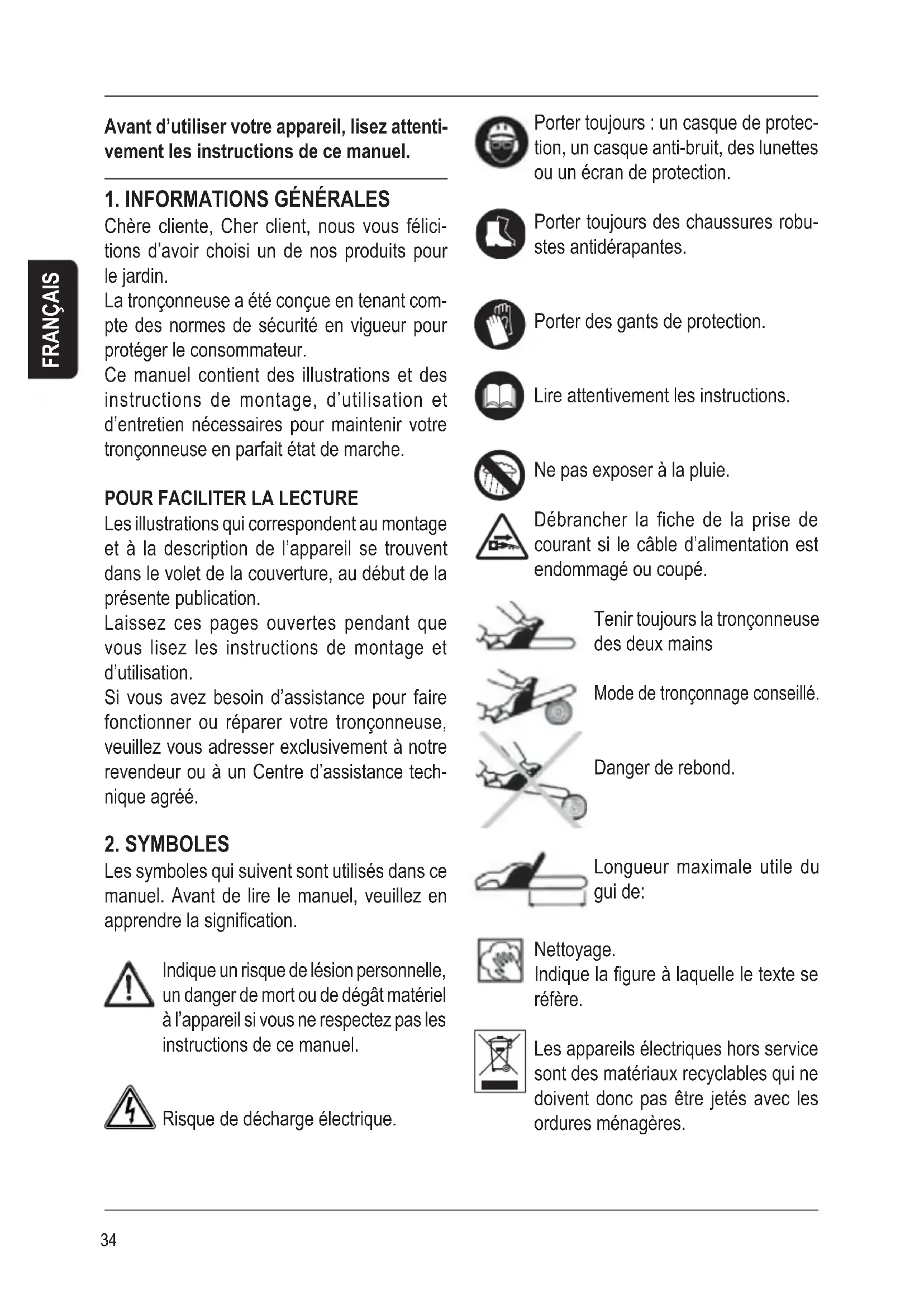 Les symboles qui suivent sont utilisés dans ce manuel. Avant de lire le manuel, veuillez en apprendre la signification. Indique un risque de lésion personnelle, un danger de mort ou de dégât matériel à l’appareil si vous ne respectez pas les instructions de ce manuel. Risque de décharge électrique. Porter toujours : un casque de protec- tion, un casque anti-bruit, des lunettes ou un écran de protection. Porter toujours des chaussures robu- stes antidérapantes. Porter des gants de protection. Lire attentivement les instructions. Ne pas exposer à la pluie. Débrancher la fiche de la prise de courant si le câble d’alimentation est endommagé ou coupé. Tenir toujours la tronçonneuse des deux mains Mode de tronçonnage conseillé. Danger de rebond. Longueur maximale utile du gui de: Nettoyage. Indique la figure à laquelle le texte se réfère. Les appareils électriques hors service sont des matériaux recyclables qui ne doivent donc pas être jetés avec les ordures ménagères.35 FRANÇAIS