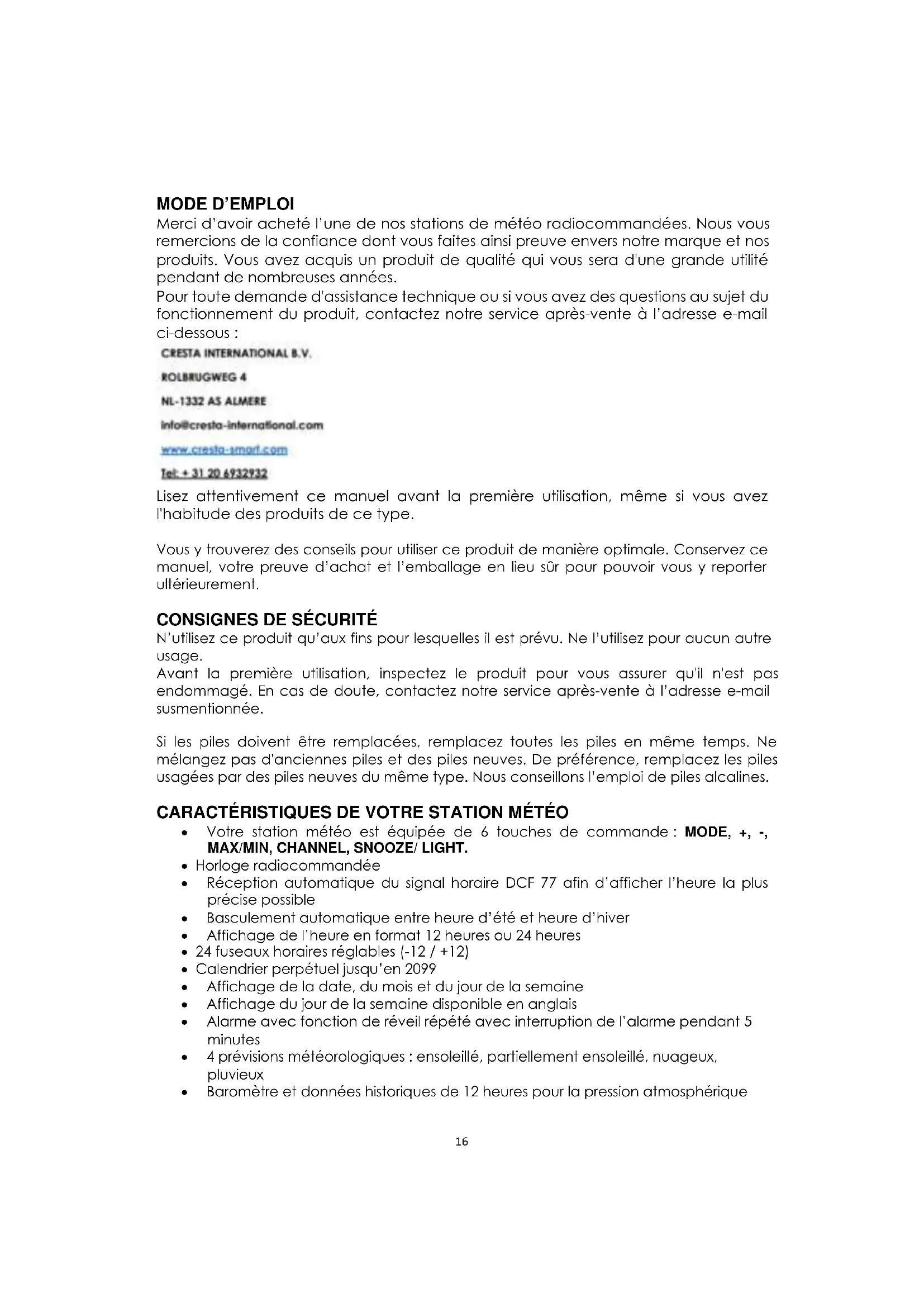 Merci d'avoir acheté l'une de nos stations de météo radiocommandées. Nous vous remercions de la confiance dont vous faites ainsi preuve envers notre marque et nos produits. Vous avez acquis un produit de qualité qui vous sera d'une grande utilité pendant de nombreuses années.