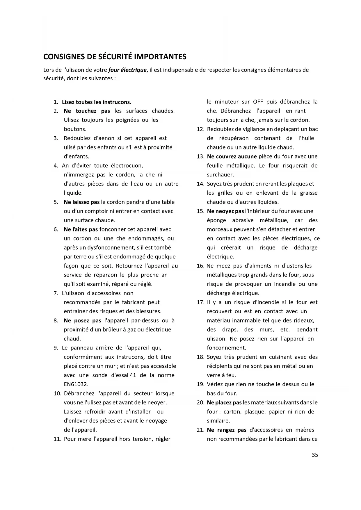 Lors de l'utilisation de votre four électrique, il est indispensable de respecter les consignes élémentaires de sécurité, dont les suivantes :