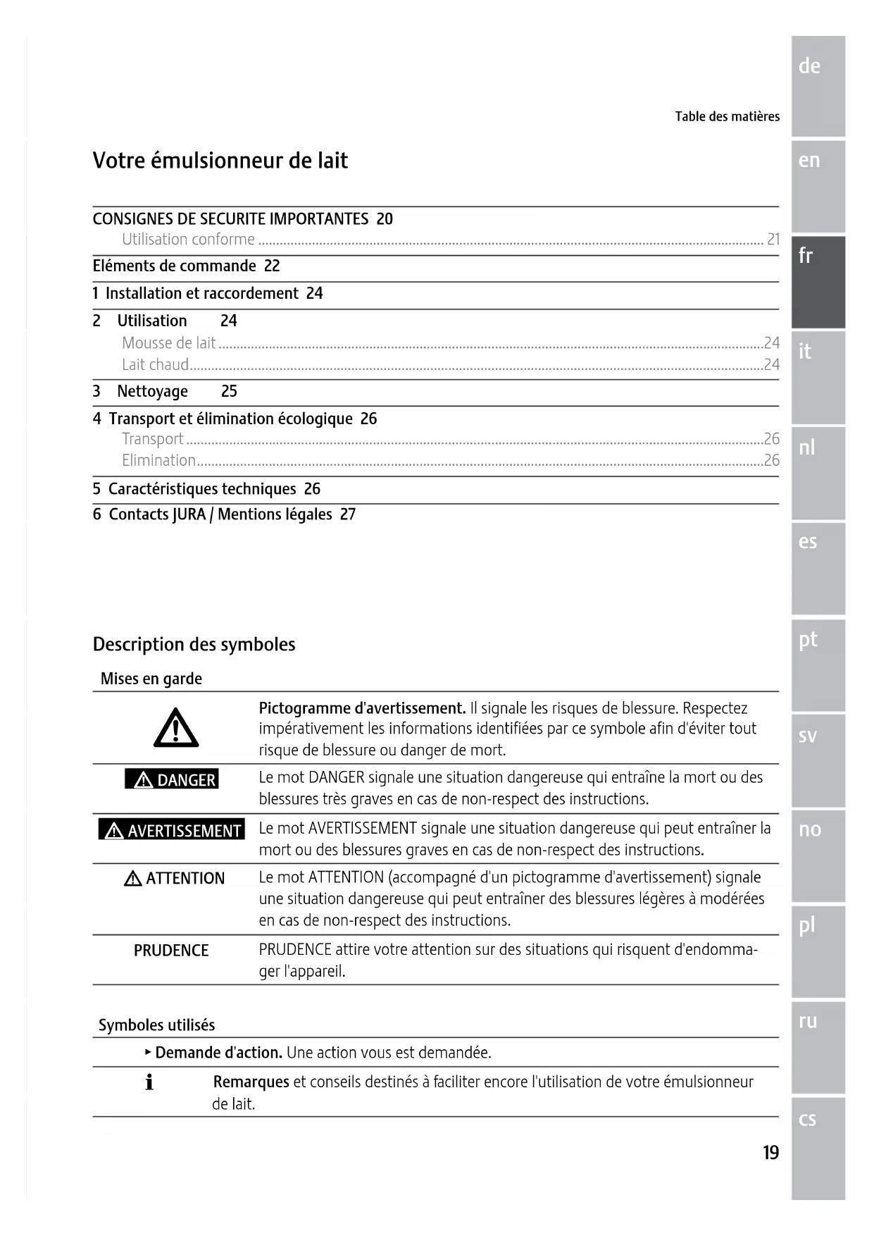 - Elimination 5 Caractéristiques techniques 266 Contacts JURA / Mentions légales 27 Description des symboles Mises en gardePictogramme d'avertissement. Il signale les risques de blessure. Respectez impérativement les informations identifiées par ce symbole afin d'éviter tout risque de blessure ou danger de mort. J DANGER Le mot DANGER signale une situation dangereuse qui entraîne la mort ou des blessures très graves en cas de non-respect des instructions. J AVERTISSEMENT Le mot AVERTISSEMENT signale une situation dangereuse qui peut entraîner la mort ou des blessures graves en cas de non-respect des instructions. J ATTENTIONLe mot ATTENTION (accompagné d'un pictogramme d'avertissement) signale une situation dangereuse qui peut entraîner des blessures légères à modérées en cas de non-respect des instructions.PRUDENCEPRUDENCE attire votre attention sur des situations qui risquent d'endomma-ger l'appareil.Symboles utilisésT Demande d'action. Une action vous est demandée. E Remarques et conseils destinés à faciliter encore l'utilisation de votre émulsionneur de lait. J20 p. 26