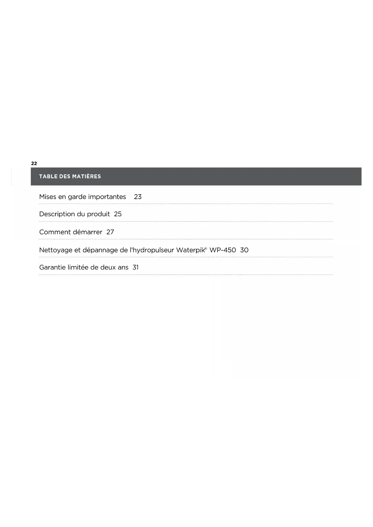 Water Pik, Inc. garantit au bénéfice de l'acquireur ou propriétaire initial que ce produit est exempt de tout vice de matériel ou de fabrication, pendant une période de deux ans à compte de la date d'achat. Conserver le reçu qui atteste de la date d'achat. Water Pik, Inc. se reserve le droit d'exiger le retard du produit pour analyse de la défaillance et confirmation de l'applicabilité de la garantie. Nous replacerons tout composant du produit dont nous constatons une défectuosity, sous réserve que le produit n'ait pas fait l'objet de modification, déterioration ou employi imprepre ou abusif après l'achat, et que le produit ait ete utilise conformément aux presentes instructions. Toute operation de réparation ou remplacement de composant couverte par la garantie sera executée par le distributeur local (pour les coordonnées du distributeur, consulter le site www.waterpik.com/intl). Le consommateur peut obtenir sur demande (envoi par courriel ou courrier postal) un exemplaire du texte complet de la garantie et les coordonnées du distributeur local. La presente garantie limite ne couvre pas les accessoires ou articles consummables, comme embouts, etc.