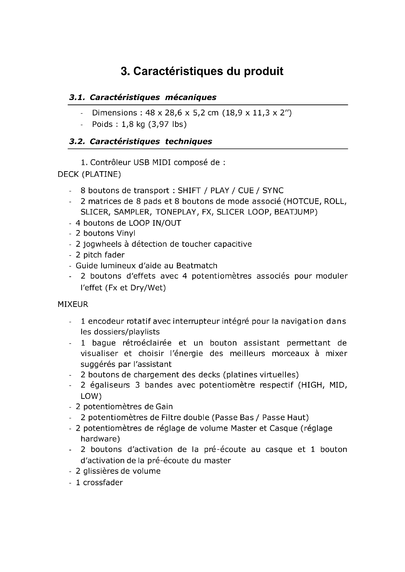 DECK (PLATINE) - 8 boutons de transport : SHIFT / PLAY / CUE / SYNC - 2 matrices de 8 pads et 8 boutons de mode associé (HOTCUE, ROLL, SLICER, SAMPLER, TONEPLAY, FX, SLICER LOOP, BEATJUMP) - 4 boutons de LOOP IN/OUT - 2 boutons Vinyl - 2 jogwheels à détection de toucher capacitive - 2 pitch fader - Guide lumineux d’aide au Beatmatch - 2 boutons d’effets avec 4 potentiomètres associés pour moduler l’effet (Fx et Dry/Wet) MIXEUR - 1 encodeur rotatif avec interrupteur intégré pour la navigation dans les dossiers/playlists - 1 bague rétroéclairée et un bouton assistant permettant de visualiser et choisir l’énergie des meilleurs morceaux à mixer suggérés par l’assistant - 2 boutons de chargement des decks (platines virtuelles) - 2 égaliseurs 3 bandes avec potentiomètre respectif (HIGH, MID, LOW) - 2 potentiomètres de Gain - 2 potentiomètres de Filtre double (Passe Bas / Passe Haut) - 2 potentiomètres de réglage de volume Master et Casque (réglage hardware) - 2 boutons d’activation de la pré-écoute au casque et 1 bouton d’activation de la pré-écoute du master - 2 glissières de volume - 1 crossfader2. Interface audio multicanal intégrée - Sortie enceintes (= sortie 1-2) avec connecteur RCA o Puissance max = 5 dBU into 1kΩ o THD+N @1 kHz ~ -80dB o Résolution = 24 bits o Fréquence d’échantillonnage = 44 kHz - Sortie casque (= sortie 3-4) avec connecteur jack 3,5 mm o Puissance max = 5 dBU into 32Ω @1Khz o THD+N @1kHz ~ -75dB o Résolution = 24 bits o Fréquence d’échantillonnage = 44 kHz4. Installation 4.1. Branchement sur l’ordinateur (connexion USB) Note : Une séquence d’allumage des LEDs, appelée Vegas Mode, se déclenche à chaque branchement du produit sur votre ordinateur. Le Vegas Mode se déroule en quatre phases permettant d’éclairer toutes les leds et d’afficher 4 couleurs possibles de la bague d’énergie multicolore rétroéclairée.4.2. Téléchargement de DJUCED