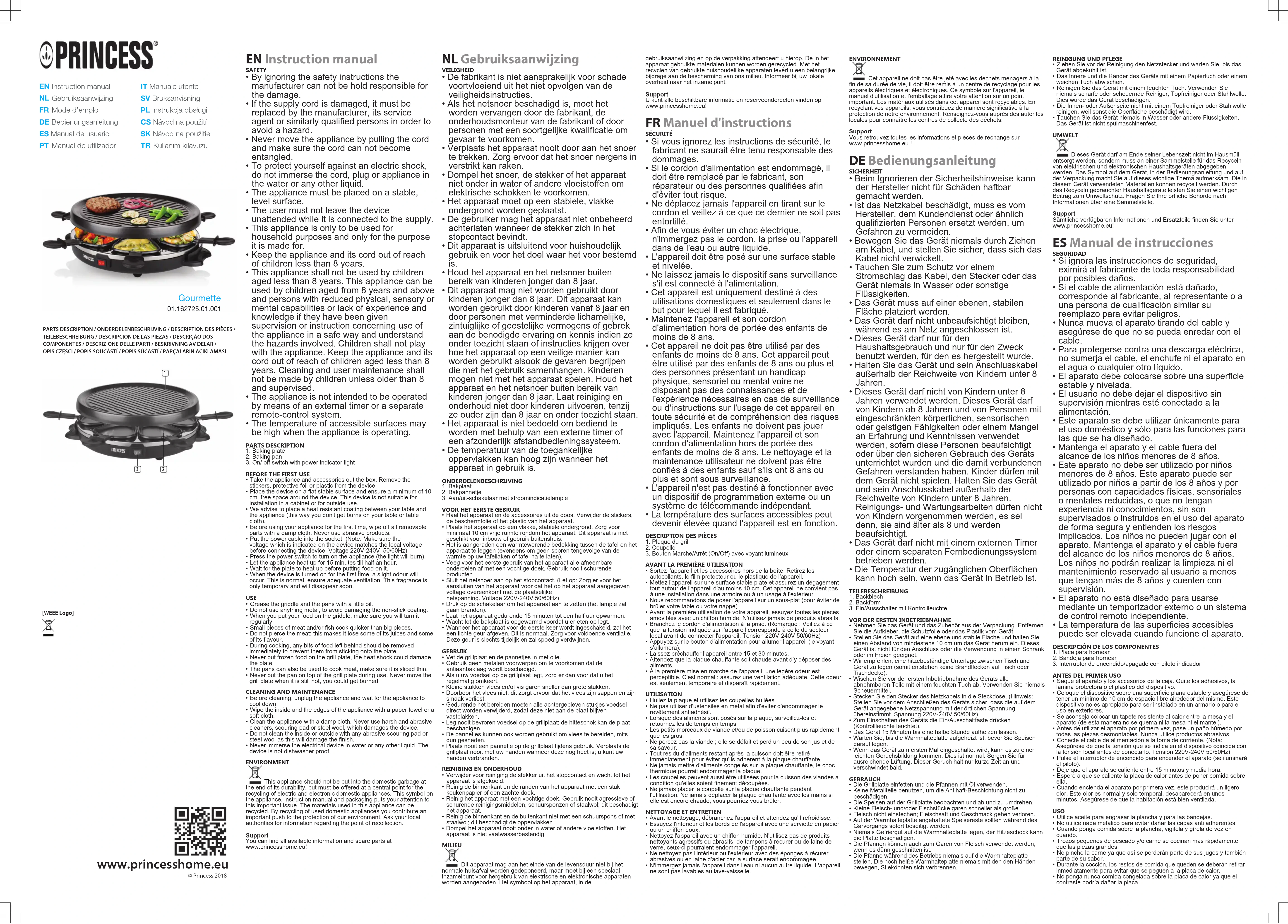 - N'immergez jamais l'appareil dans l'eau ni aucun autre liquide. L'appareil ne sont pas lavables au lave-vaisselle.ENVIRONNEMENTCet appareil ne doit pas être jeté avec les déchets ménagers à lafin de sa durée de vie, il doit être remis à un centre de recyclage pour lesappareils électriques et électroniques. Ce symbole sur l'appareil, lemanuel d'utilisation et l'emballage attire votre attention sur un pointimportant. Les matériaux utilisés dans cet appareil sont recyclables. Enrecyclant vos appareils, vous contribuez de manière significative à laprotection de notre environnement. Renseignez-vous auprès des autoritéslocales pour connaître les centres de collecte des déchets.SupportVous retrouvez toutes les informations et pièces de rechange surwww.princesshome.eu! DEBedienungsanleitung SICHERHEIT