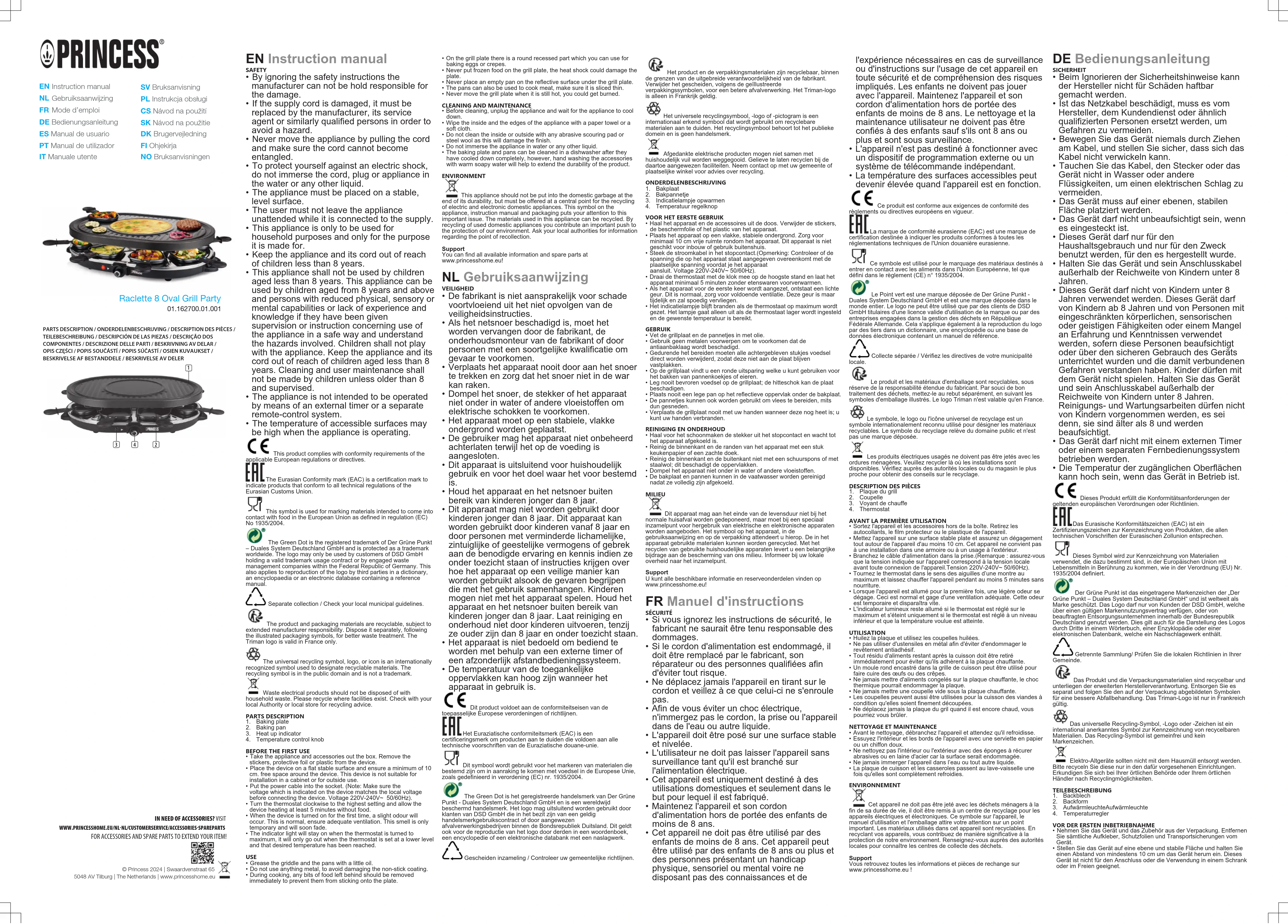 - La plaque de cuisson et les casseroles passent au lave-vaisselle une fois qu'elles sont complètement refroidies. ENVIRONNEMENT Cet appareil ne doit pas être jeté avec les déchets ménagers à la fin de sa durée de vie, il doit être remis à un centre de recyclage pour les appareils électriques et électroniques. Ce symbole sur l'appareil, le manuel d'utilisation et l'emballage attire votre attention sur un point important. Les matériaux utilisés dans cet appareil sont recyclables. En recyclant vos appareils, vous contribuez de manière significative à la protection de notre environnement. Renseignez-vous auprès des autorités locales pour connaître les centres de collecte des déchets. Support Vous retrouvez toutes les informations et pièces de rechange sur www.princesshome.eu! DEBedienungsanleitung SICHERHEIT