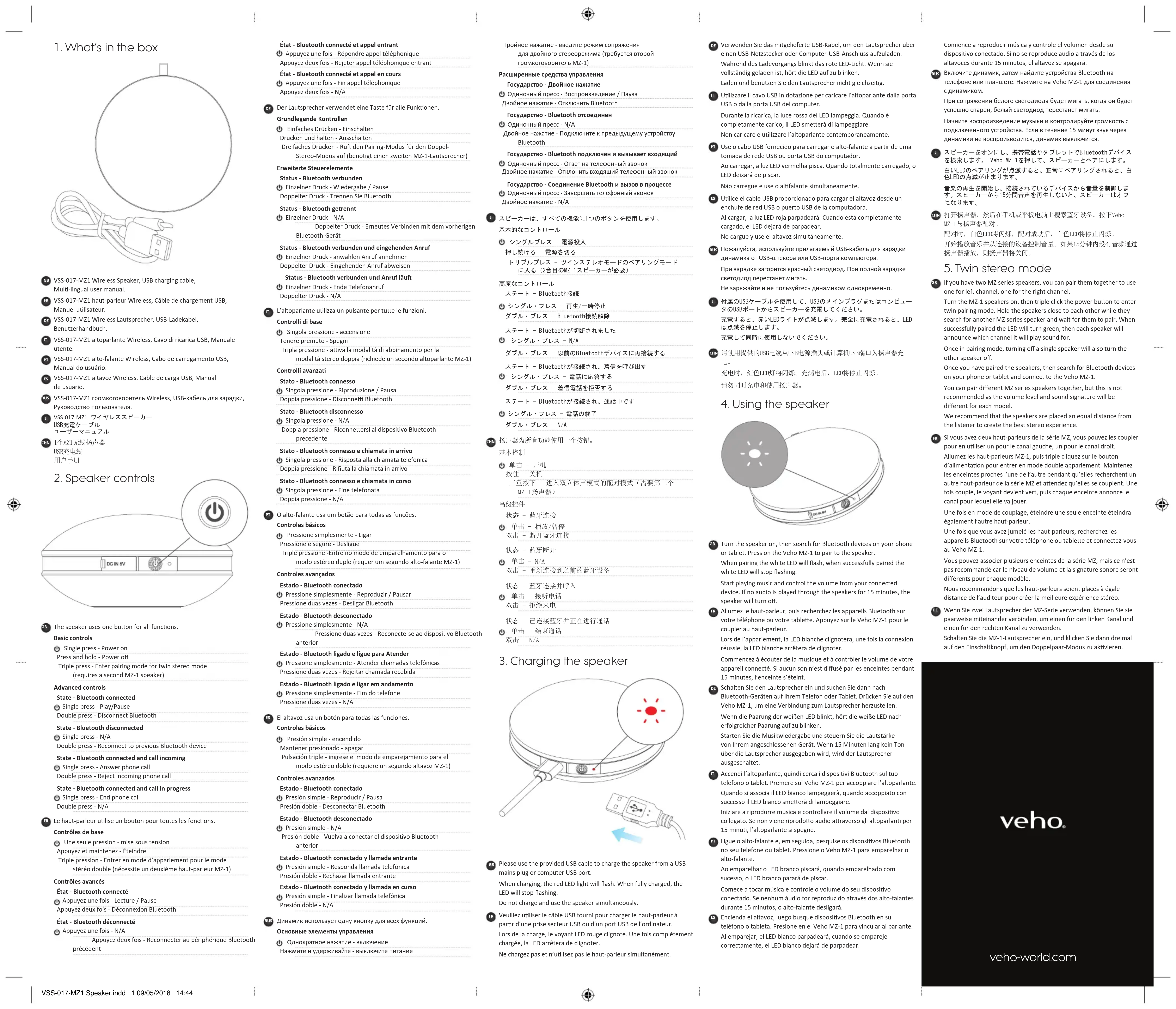 If you have two MZ series speakers, you can pair them together to use one for le channel, one for the right channel. Turn the MZ-1 speakers on, then triple click the power buon to enter twin pairing mode. Hold the speakers close to each other while they search for another MZ series speaker and wait for them to pair. When successfully paired the LED will turn green, then each speaker will announce which channel it will play sound for. Once in pairing mode, turning o a single speaker will also turn the other speaker o. Once you have paired the speakers, then search for Bluetooth devices on your phone or tablet and connect to the Veho MZ-1. You can pair dierent MZ series speakers together, but this is not recommended as the volume level and sound signature will be dierent for each model. We recommend that the speakers are placed an equal distance from the listener to create the best stereo experience. Si vous avez deux haut-parleurs de la série MZ, vous pouvez les coupler pour en uliser un pour le canal gauche, un pour le canal droit. Allumez les haut-parleurs MZ-1, puis triple cliquez sur le bouton d’alimentaon pour entrer en mode double appariement. Maintenez les enceintes proches l’une de l’autre pendant qu’elles recherchent un autre haut-parleur de la série MZ et aendez qu’elles se couplent. Une fois couplé, le voyant devient vert, puis chaque enceinte annonce le canal pour lequel elle va jouer. Une fois en mode de couplage, éteindre une seule enceinte éteindra également l’autre haut-parleur. Une fois que vous avez jumelé les haut-parleurs, recherchez les appareils Bluetooth sur votre téléphone ou tablee et connectez-vous au Veho MZ-1. Vous pouvez associer plusieurs enceintes de la série MZ, mais ce n’est pas recommandé car le niveau de volume et la signature sonore seront diérents pour chaque modèle. Nous recommandons que les haut-parleurs soient placés à égale distance de l’auditeur pour créer la meilleure expérience stéréo. Wenn Sie zwei Lautsprecher der MZ-Serie verwenden, können Sie sie paarweise miteinander verbinden, um einen für den linken Kanal und einen für den rechten Kanal zu verwenden. Schalten Sie die MZ-1-Lautsprecher ein, und klicken Sie dann dreimal auf den Einschaltknopf, um den Doppelpaar-Modus zu akvieren. veho-world.com RUS