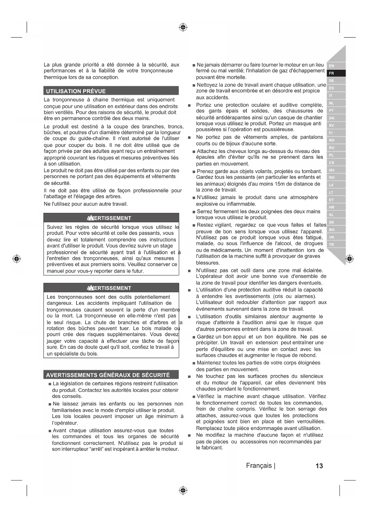 AVERTISSEMENTS DE SECURITE RELATIFS À LA TRONCONNEUSE