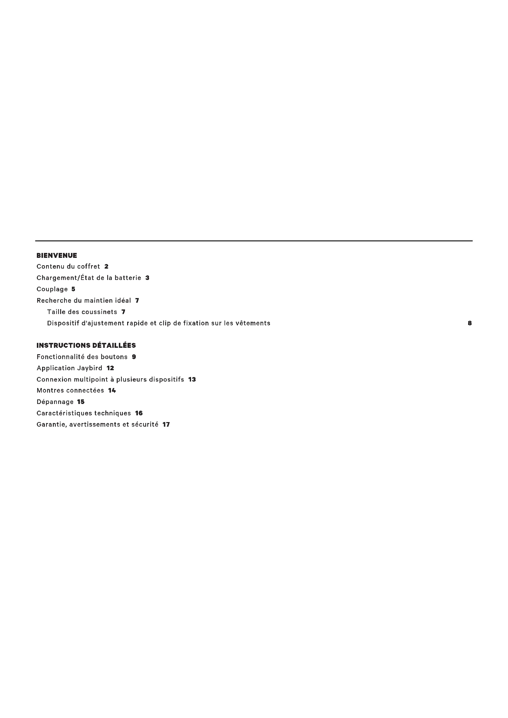 Fonctionnalité des boutons 9 Application Jaybird 12 Connexion multipoint à plusieurs dispositifs 13 Montres connectées 14 Dépannage 15 Caractéristiques techniques 16 Garantie, avertissements et sécurité 17BIENVENUE JAYBIRDTARAH PERFORMANCES ESSENTIELLES