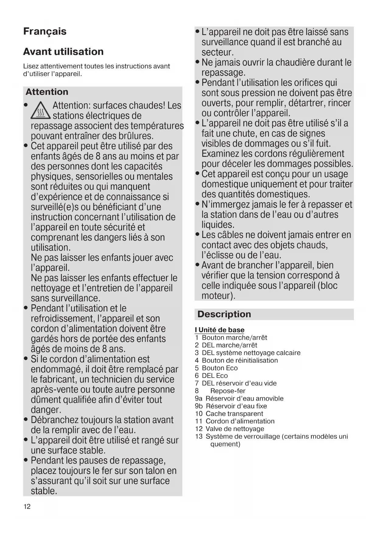 Attention: surfaces chaudes! Les stations électriques de repassage associant des températures pouvant entraîner des brûlures. - Cet appareil peut être utilisé par des enfants âgés de 8 ans au moins et par des personnes dont les capacités physiques, sensorielles ou mentales sont réduites ou qui manquent d'expérience et de connaissances si surveillance(s) ou bénéficiant d'une instruction concernant l'utilisation de l'appareil en toute sécurité et complétant les dangers liés à son utilisation.