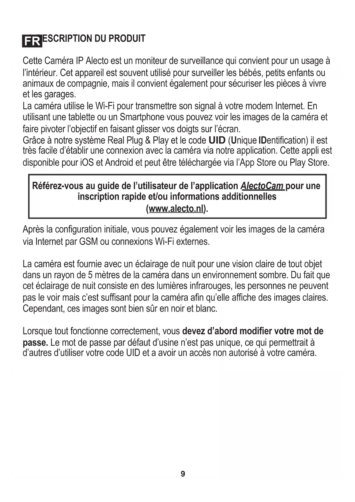 Cette Caméra IP Alecto est un moniteur de surveillance qui convient pour un usage à l’intérieur. Cet appareil est souvent utilisé pour surveiller les bébés, petits enfants ou animaux de compagnie, mais il convient également pour sécuriser les pièces à vivre et les garages. La caméra utilise le Wi-Fi pour transmettre son signal à votre modem Internet. En utilisant une tablette ou un Smartphone vous pouvez voir les images de la caméra et faire pivoter l’objectif en faisant glisser vos doigts sur l’écran. Grâce à notre système Real Plug & Play et le code UID (Unique IDentication) il est très facile d’établir une connexion avec la caméra via notre application. Cette appli est disponible pour iOS et Android et peut être téléchargée via l’App Store ou Play Store. Après la conguration initiale, vous pouvez également voir les images de la caméra via Internet par GSM ou connexions Wi-Fi externes. La caméra est fournie avec un éclairage de nuit pour une vision claire de tout objet dans un rayon de 5 mètres de la caméra dans un environnement sombre. Du fait que cet éclairage de nuit consiste en des lumières infrarouges, les personnes ne peuvent pas le voir mais c’est sufsant pour la caméra an qu’elle afche des images claires. Cependant, ces images sont bien sûr en noir et blanc. Lorsque tout fonctionne correctement, vous devez d’abord modier votre mot de passe. Le mot de passe par défaut d’usine n’est pas unique, ce qui permettrait à d’autres d’utiliser votre code UID et a avoir un accès non autorisé à votre caméra.