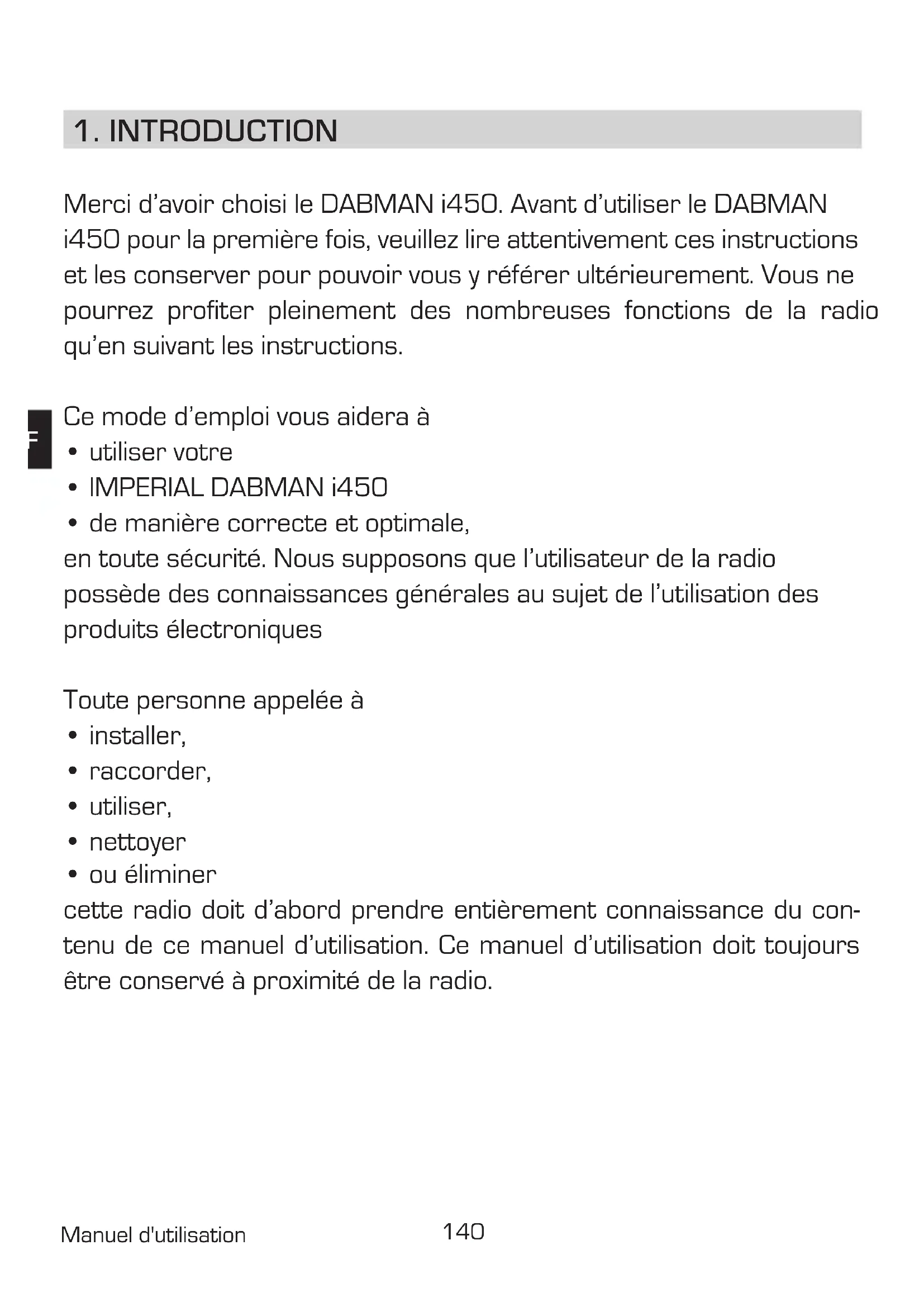 cette radio doit d'abord prendre entièrement connaissance du contenu de ce manuel d'utilisation. Ce manuel d'utilisation doit toujours être conservé à proximité de la radio.
