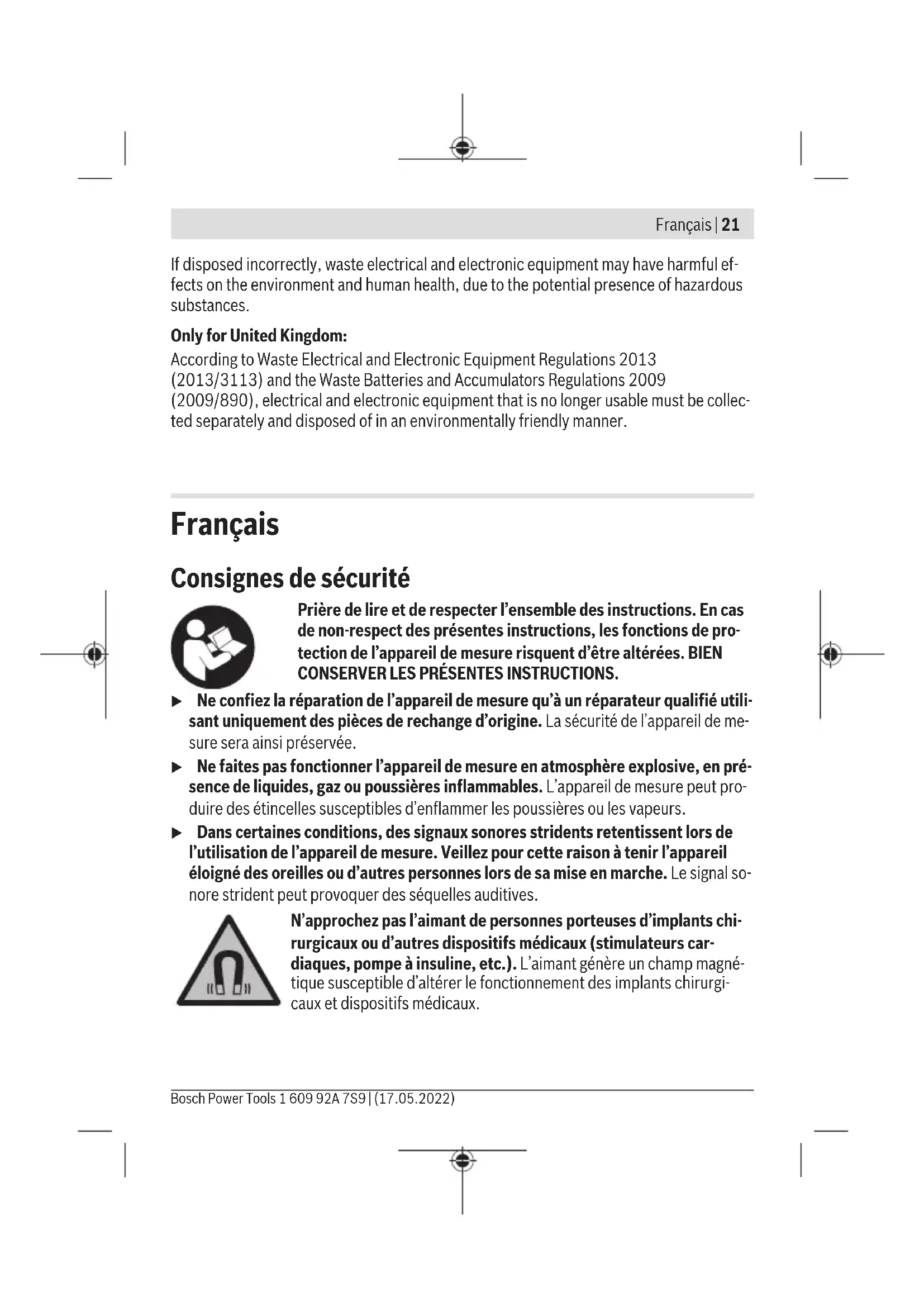 Piles 2×1,5V LR3(AAA) Autonomie approx. 30h Poids selon EPTA-Procedure01:2014 0,12kg Dimensions (longueur x largeur x hauteur) 69×28×123mm Bosch Power Tools 1 609 92A 7S9 | (17.05.2022)24 | Français Cellule de réception laser LR 6 Indice de protection IP54 (protection contre la poussière et les projections d’eau) A) La portée peut être réduite par des conditions défavorables (par ex. exposition directe au so- leil). B) X: portée maximale avec cellule de réception laser, conformément aux indications de la notice d’utilisation du laser lignesBosch utilisé C) dépend de la distance entre cellule de réception et laser lignes D) N’est conçu que pour les salissures/saletés non conductrices mais supporte occasionnellement la conductivité due aux phénomènes de condensation. Pour une identification précise de votre cellule de réception, utilisez le numéro de série (13) inscrit sur l’étiquette signalétique. Informations concernant le niveau sonore Le niveau de pression acoustique en dB(A) typique du signal sonore est de80dB(A). Ne tenez pas la cellule de réception près de l’oreille! Montage Mise en place/remplacement des piles Pour le bon fonctionnement de la cellule de réception, nous recommandons d’utiliser des piles alcalines au manganèse. Tirez vers l’extérieur le blocage (15) du compartiment à piles et relevez le couvercle (14). Insérez les piles. Respectez ce faisant la polarité indiquée sur le graphique du couvercle de compartiment à piles. Lorsque les piles sont faibles, la LED d’état(3) se met à clignoter. Il est alors possible de continuer à travailler avec la cellule de réception pendant environ 2h. Remplacez toujours toutes les piles en même temps. N’utilisez que des piles de la même marque et de même capacité. u Sortez les piles de la cellule de réception laser si vous savez qu’elle ne sera pas utilisée pendant une période prolongée. Les piles risquent sinon de se corroder et de se décharger. 1 609 92A 7S9 | (17.05.2022) Bosch Power ToolsFrançais | 25 Utilisation Mise en marche u Protégez la cellule de réception de l’humidité et des rayons directs du soleil. u N’exposez pas la cellule de réception laser à des températures extrêmes et évi- tez les brusques variations de température. Ne la laissez p. ex. pas trop longtemps dans une voiture exposée au soleil. Après un brusque changement de température, at- tendez que la cellule de réception revienne à la température ambiante avant de l’utili- ser. Des températures extrêmes ou de brusques changements de température peuvent altérer la précision de la cellule de réception laser. Installation de la cellule de réception laser (voirfigureA) Installez la cellule de réception laser à au moins5m du laser lignes. Assurez-vous que le mode cellule de réception est actif sur le laser lignes. Sélectionnez un mode de fonction- nement où seul un plan laser horizontal ou vertical est généré. Remarque : Ne choisissez pas un mode combinant un plan horizontal et un plan vertical (mode croix) car il risque alors d’y avoir un affichage erroné de la hauteur du faisceau la- ser. Placez la cellule de réception de manière à ce que le faisceau laser puisse atteindre la zone de réception(9). Ajustez-la de façon à que le faisceau laser touche la zone de ré- ception transversalement (comme représenté sur la figure). Mise en marche/arrêt u À la mise en marche de la cellule de réception, un puissant signal sonore retentit. Veillez pour cette raison à tenir la cellule de réception éloignée des oreilles ou d’autres personnes lors de sa mise en marche. Le puissant signal sonore peut pro- voquer des séquelles auditives. Pour mettre en marche la cellule de réception, appuyez sur la touche Marche/Arrêt(2). Toutes les LED s’allument brièvement et un signal sonore retentit. À la mise en marche de la cellule de réception, le son est toujours réglé sur «basse inten- sité» et la précision de réception sur «fine». Pour arrêter la cellule de réception, appuyez à nouveau sur la touche Marche/Arrêt(2). Toutes les LED s’allument brièvement avant que l’appareil ne s’éteigne et trois bips so- nores retentissent. La LED d’état(3) s’éteint. Si aucune touche n’est actionnée pendant env. 20min et si aucun faisceau laser n’atteint la zone de réception(9) pendant 20min, la cellule de réception s’arrête automatique- ment pour ménager les piles. Bosch Power Tools 1 609 92A 7S9 | (17.05.2022)26 | Français Sélection du réglage de l’affichage de ligne médiane La touche de réglage de précision de réception(1) permet de définir la précision avec la- quelle la position du faisceau laser dans la zone de réception sera reconnue comme «centrale»: – précision de réception «fine» (la LED «Ligne médiane»(7) clignote), – précision de réception «grossière» (les LED «Faisceau laser au-dessus de la ligne médiane»(6) et «Faisceau laser en dessous de la ligne médiane» (8) clignotent). Indications de direction La position du faisceau laser dans la zone de réception(9) est indiquée: – par les LED «Faisceau laser au-dessus de la ligne médiane»(6), «Faisceau laser au dessous de la ligne médiane»(8) ou «Ligne médiane»(7) à l’avant et au dos de la cellule de réception, – par un signal sonore (si activé). Cellule de réception trop basse: Si le faisceau laser atteint la partie supérieure de la zone de réception(9), les LED «Faisceau laser au-dessus de la ligne médiane»(6) s’al- lument. Si le signal sonore est activé, un signal sonore de fréquence élevée retentit. Déplacez alors la cellule de réception vers le haut dans le sens de la flèche. Cellule de réception trop haute: Si le faisceau laser atteint la partie inférieure de la zone de réception(9), les LED «Faisceau laser en dessous de la ligne médiane»(8) s’al- lument. Si le signal sonore est activé, un signal sonore de
