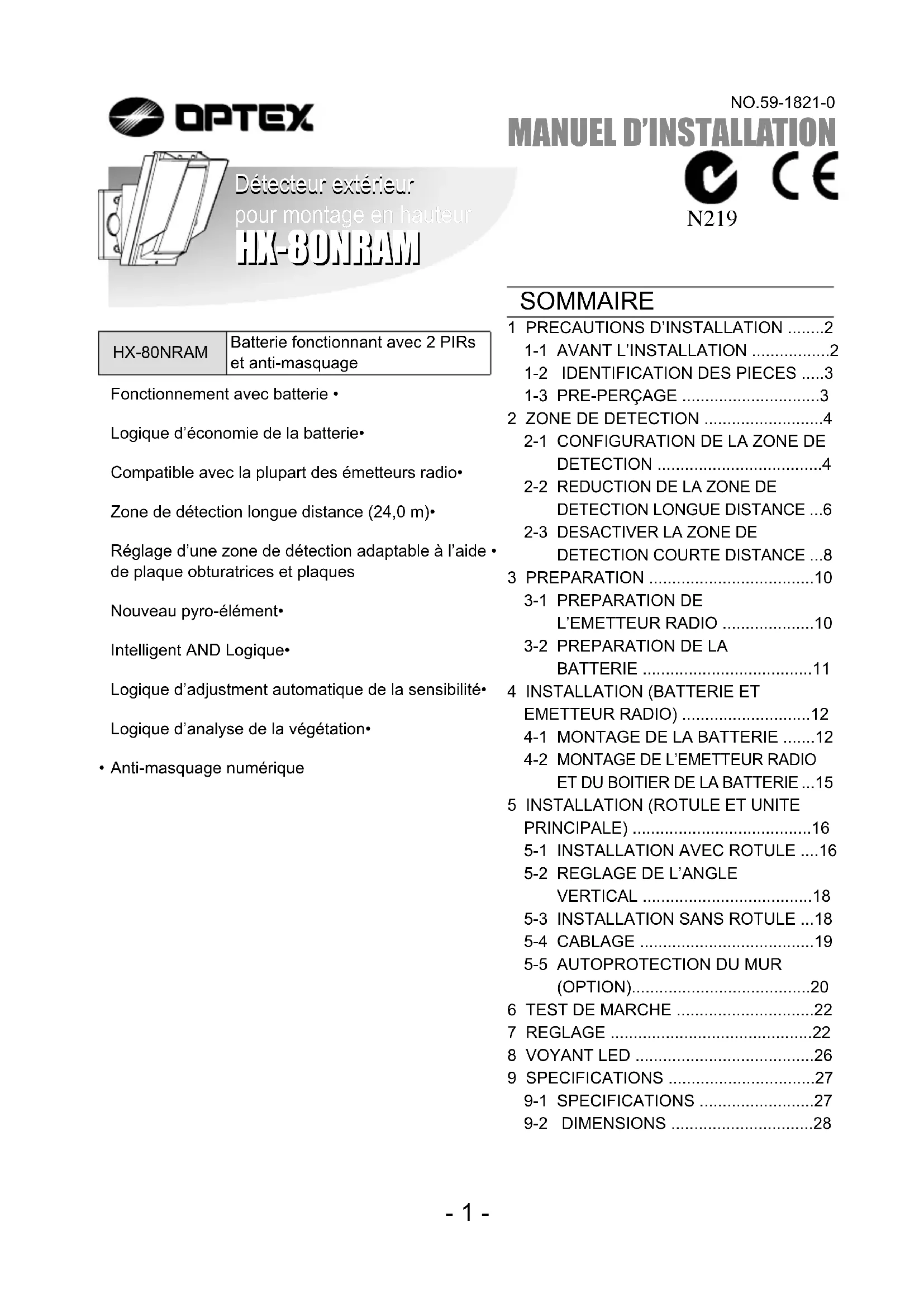 N219 Détecteur extérieur pour montage en hauteur SOMMAIRE