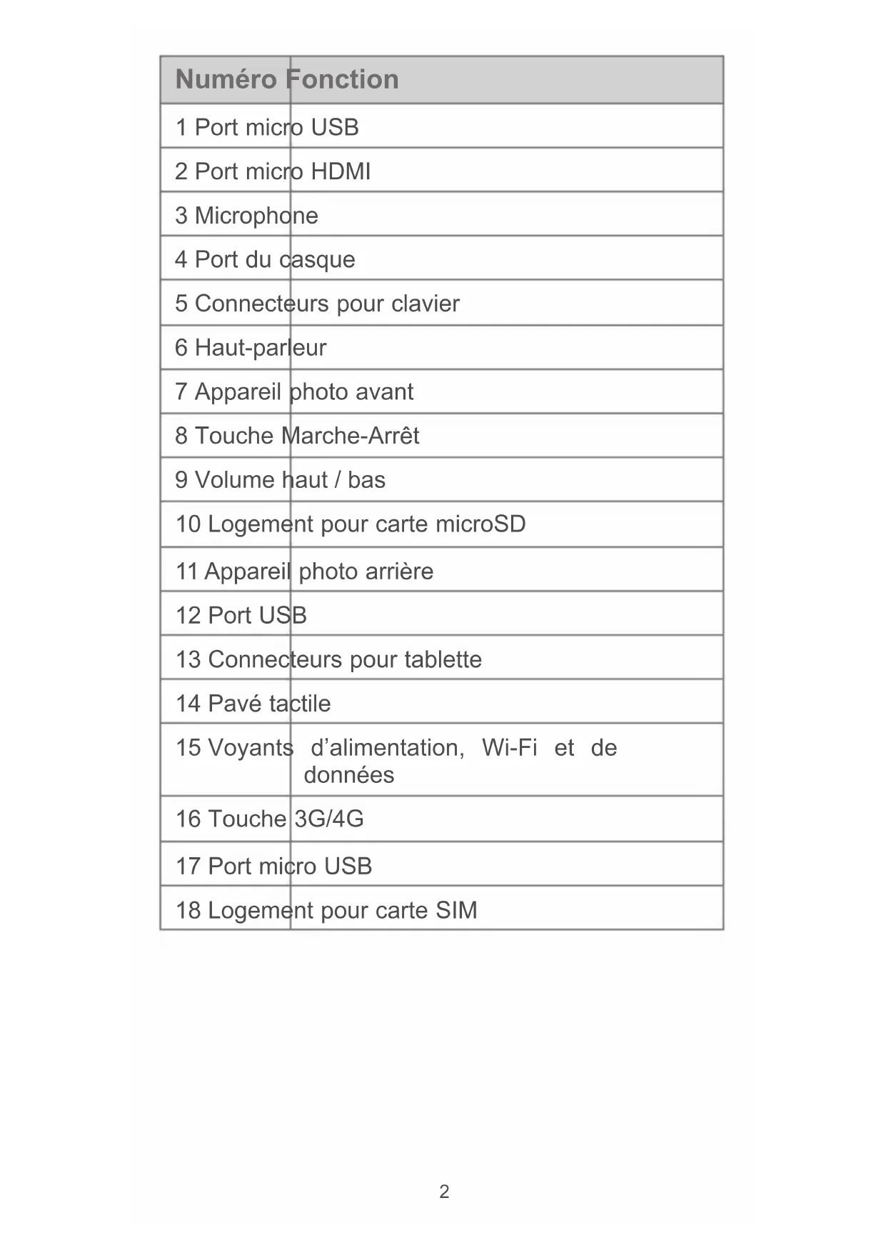 Numéro Fonction 1 Port micro USB 2 Port micro HDMI 3 Microphone 4 Port du casque 5 Connecteurs pour clavier 6 Haut-parleur 7 Appareil photo avant 8 Touche Marche-Arrêt 9 Volume haut / bas 10 Logement pour carte microSD 11 Appareil photo arrière 12 Port USB 13 Connecteurs pour tablette 14 Pavé tactile 15 Voyants d’alimentation, Wi-Fi et de données 16 Touche 3G/4G 17 Port micro USB 18 Logement pour carte SIM3