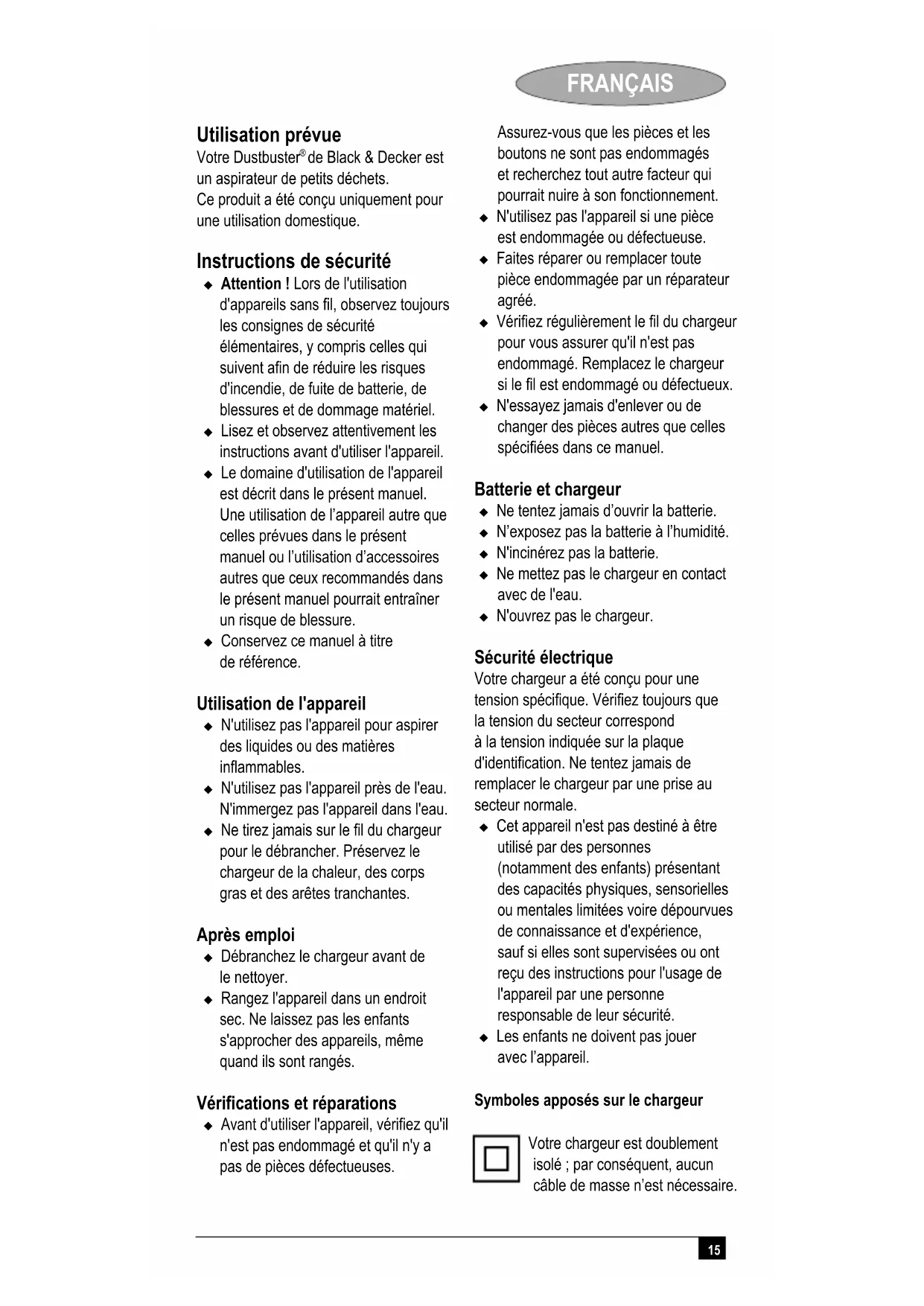 de Black & Decker est un aspirateur de petits déchets. Ce produit a été conçu uniquement pour une utilisation domestique. Instructions de sécurité Attention ! Lors de l'utilisation d'appareils sans fil, observez toujours les consignes de sécurité élémentaires, y compris celles qui suivent afin de réduire les risques d'incendie, de fuite de batterie, de blessures et de dommage matériel. Lisez et observez attentivement les instructions avant d'utiliser l'appareil. Le domaine d'utilisation de l'appareil est décrit dans le présent manuel. Une utilisation de l’appareil autre que celles prévues dans le présent manuel ou l’utilisation d’accessoires autres que ceux recommandés dans le présent manuel pourrait entraîner un risque de blessure. Conservez ce manuel à titre de référence. Utilisation de l'appareil N'utilisez pas l'appareil pour aspirer des liquides ou des matières inflammables. N'utilisez pas l'appareil près de l'eau. N'immergez pas l'appareil dans l'eau. Ne tirez jamais sur le fil du chargeur pour le débrancher. Préservez le chargeur de la chaleur, des corps gras et des arêtes tranchantes. Après emploi Débranchez le chargeur avant de le nettoyer. Rangez l'appareil dans un endroit sec. Ne laissez pas les enfants s'approcher des appareils, même quand ils sont rangés. Vérifications et réparations Avant d'utiliser l'appareil, vérifiez qu'il n'est pas endommagé et qu'il n'y a pas de pièces défectueuses. Assurez-vous que les pièces et les boutons ne sont pas endommagés et recherchez tout autre facteur qui pourrait nuire à son fonctionnement. N'utilisez pas l'appareil si une pièce est endommagée ou défectueuse. Faites réparer ou remplacer toute pièce endommagée par un réparateur agréé. Vérifiez régulièrement le fil du chargeur pour vous assurer qu'il n'est pas endommagé. Remplacez le chargeur si le fil est endommagé ou défectueux. N'essayez jamais d'enlever ou de changer des pièces autres que celles spécifiées dans ce manuel. Batterie et chargeur Ne tentez jamais d’ouvrir la batterie. N’exposez pas la batterie à l’humidité. N'incinérez pas la batterie. Ne mettez pas le chargeur en contact avec de l'eau. N'ouvrez pas le chargeur. Sécurité électrique Votre chargeur a été conçu pour une tension spécifique. Vérifiez toujours que la tension du secteur correspond à la tension indiquée sur la plaque d'identification. Ne tentez jamais de remplacer le chargeur par une prise au secteur normale. Cet appareil n'est pas destiné à être utilisé par des personnes (notamment des enfants) présentant des capacités physiques, sensorielles ou mentales limitées voire dépourvues de connaissance et d'expérience, sauf si elles sont supervisées ou ont reçu des instructions pour l'usage de l'appareil par une personne responsable de leur sécurité. Les enfants ne doivent pas jouer avec l’appareil. Symboles apposés sur le chargeur Votre chargeur est doublement isolé ; par conséquent, aucun câble de masse n’est nécessaire.16 FRANÇAIS Transformateur à sécurité intrinsèque. L’alimentation secteur est électriquement séparée de la sortie du transformateur. Le chargeur s’arrête automatiquement si la température ambiante est trop élevée. Par conséquent, le chargeur devient inutilisable. L’unité doit être débranchée du secteur puis apportée à un centre d’entretien agréé pour réparation. Le chargeur a été conçu pour être utilisé uniquement à l’intérieur. Lisez et observez attentivement les instructions avant d'utiliser l'appareil. Attention ! Maintenez les appareils électriques hors de portée des enfants et des personnes infirmes. Ne les laissez pas utiliser les appareils sans votre supervision. Caractéristiques
