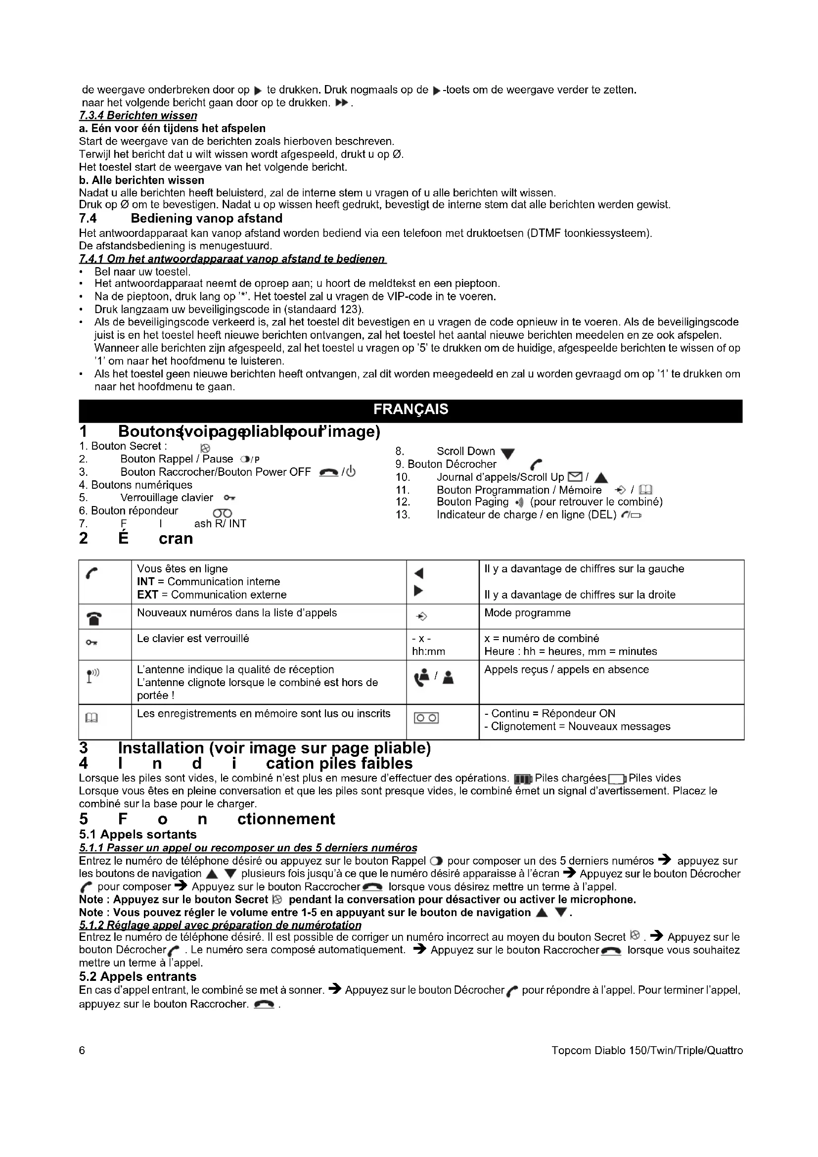 Appuyez sur le bouton Call Log . Le dernier appel reçu apparaît à l’écran. Si la liste est vide, ’----------’ s’affiche. Pour les appels reçus, l’icône apparaît et pour les appels en absence, l’icône apparaît Î Appuyez sur le bouton de programmation pour afficher les autres chiffres (si plus long que 12) ou pour montrer la date et l’heure. Î Utilisez les boutons de navigation pour aller à l’appel précédent. Lorsque vous atteignez le haut ou le bas de la liste, une tonalité d’erreur retentira Î Vous pouvez quitter la liste d’appels en appuyant sur le bouton Raccrocher . Vous pouvez composer le numéro en appuyant sur le bouton Décrocher. . /P8 Topcom Diablo 150/Twin/Triple/Quattro 7 Répondeur Le Diablo dispose d’un répondeur numérique intégré avec une capacité d’enregistrement de 11 min. Le répondeur peut être commandé à partir du combiné et à distance. Il offre la possibilité d’enregistrer deux messages sortants (OGM 1 et OGM 2) (maximum de 3 min.). Il y a 2 possibilités :