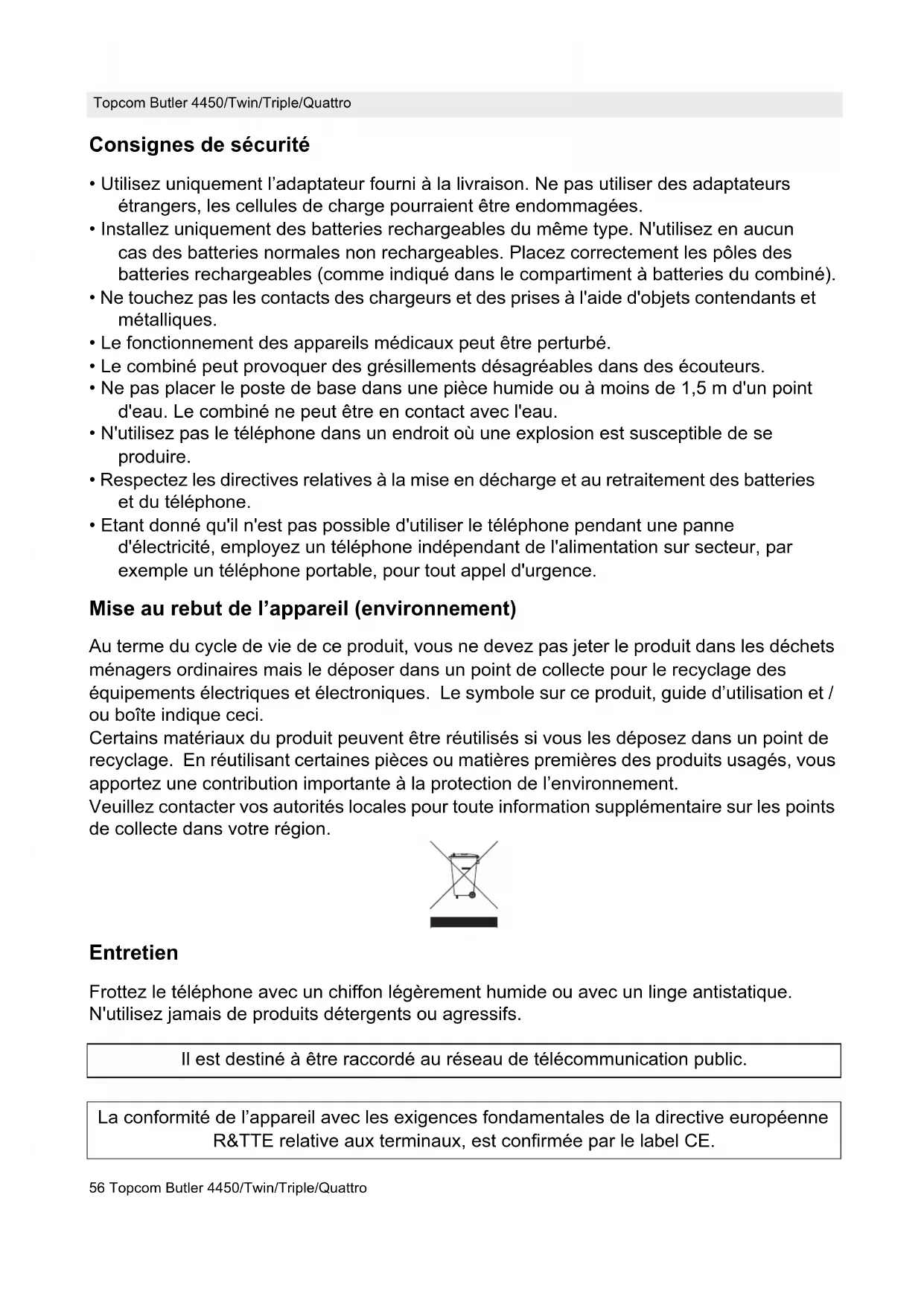 - Etant donné qu'il n'est pas possible d'utiliser le téléphone pendant une panne d'électricité, employez un téléphone indépendant de l'alimentation sur secteur, par exemple un téléphone portable, pour tout appel d'urgence. Mise au rebut de l’appareil (environnement) Au terme du cycle de vie de ce produit, vous ne devez pas jeter le produit dans les déchets ménagers ordinaires mais le déposer dans un point de collecte pour le recyclage des équipements électriques et électroniques. Le symbole sur ce produit, guide d’utilisation et / ou boîte indique ceci. Certains matériaux du produit peuvent être réutilisés si vous les déposez dans un point de recyclage. En réutilisant certaines pièces ou matières premières des produits usagés, vous apportez une contribution importante à la protection de l’environnement. Veuillez contacter vos autorités locales pour toute information supplémentaire sur les points de collecte dans votre région. Entretien Frottez le téléphone avec un chiffon légèrement humide ou avec un linge antistatique. N'utilisez jamais de produits détergents ou agressifs. Il est destiné à être raccordé au réseau de télécommunication public. La conformité de l’appareil avec les exigences fondamentales de la directive européenne R&TTE relative aux terminaux, est confirmée par le label CE.Topcom Butler 4450/Twin/Triple/Quattro 57 Topcom Butler 4450/Twin/Triple/Quattro FRANÇAIS 1 Description du telephone