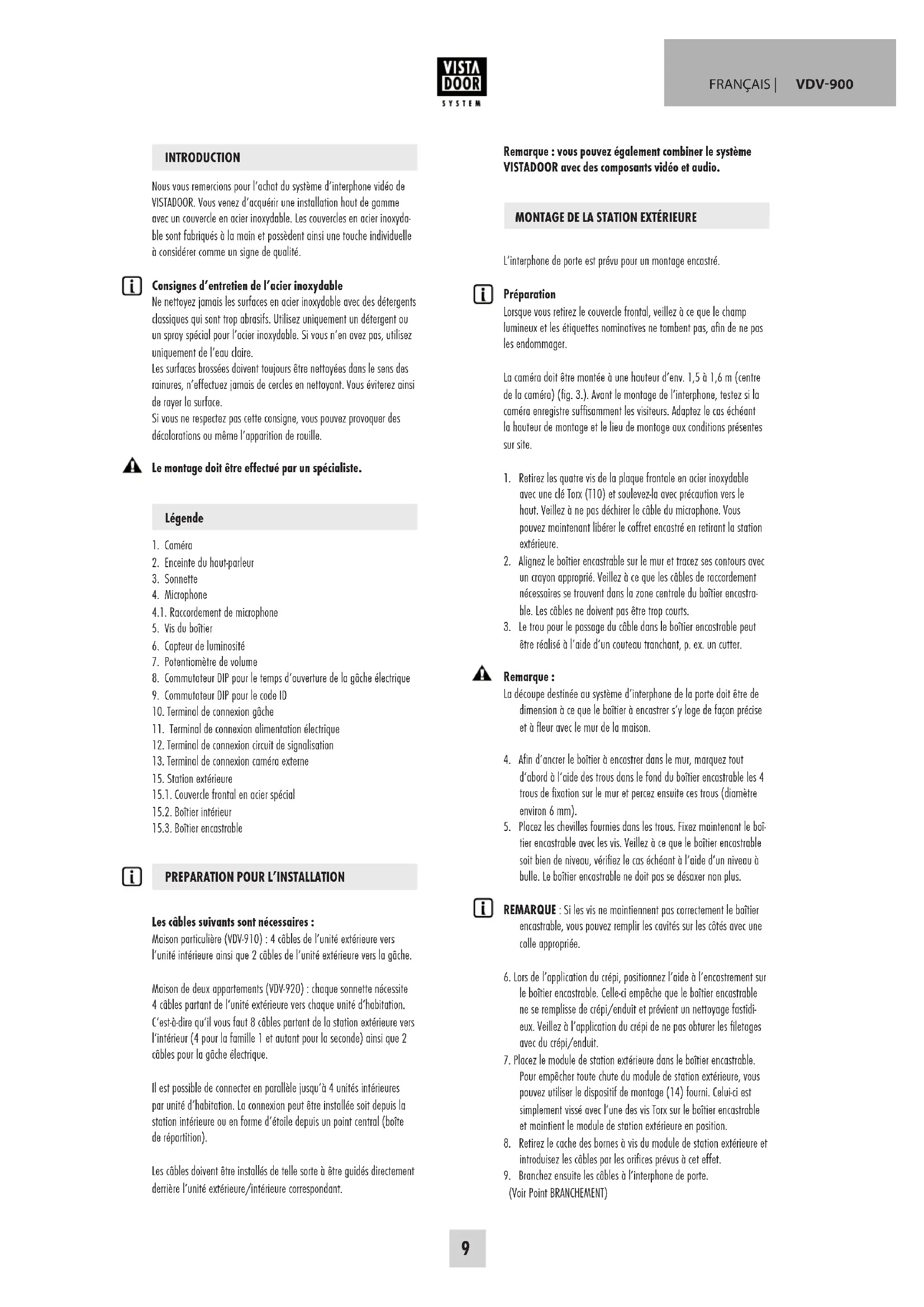 Nous vous remercions pour l'achat du système d'interphone vidéo de VISTADOOR. Vous venez d'acquérir une installation haut de gamme avec un couvercle en acier inoxydable. Les couvercles en acier inoxydable sont fabriqués à la main et possèdent ainsi une touche individuelle à considérer comme un signe de qualité.