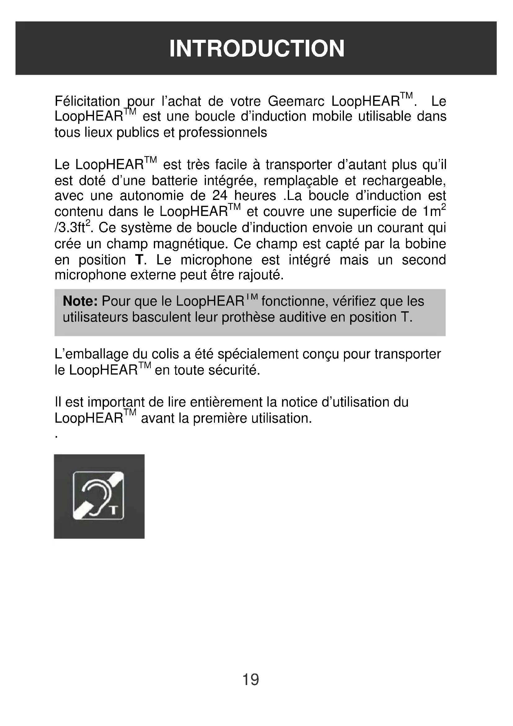 Félicitation pour l'achat de votre Geemarc LoopHEAR™. Le LoopHEAR™ est une boucle d'induction mobile utilisable dans tous lieux publics et professionnels