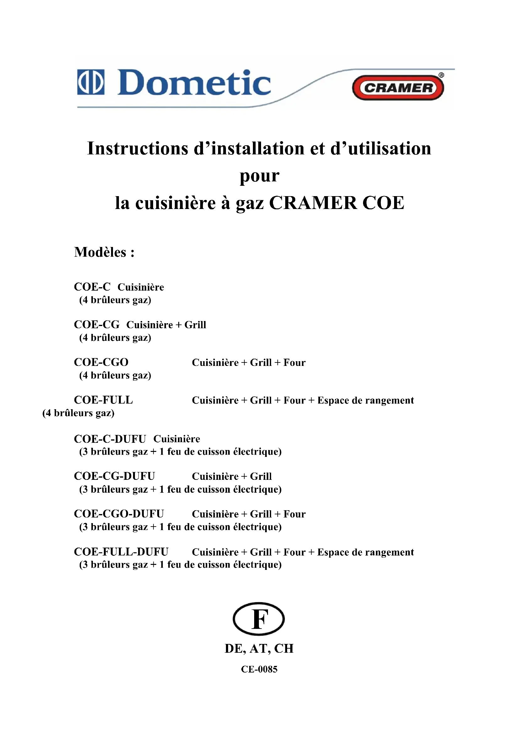 Instructions d’installation et d’utilisation pour la cuisinière à gaz CRAMER COE Modèles : COE-C Cuisinière (4 brûleurs gaz) COE-CG Cuisinière + Grill (4 brûleurs gaz) COE-CGO Cuisinière + Grill + Four (4 brûleurs gaz) COE-FULL Cuisinière + Grill + Four + Espace de rangement (4 brûleurs gaz) COE-C-DUFU Cuisinière (3 brûleurs gaz + 1 feu de cuisson électrique) COE-CG-DUFU Cuisinière + Grill (3 brûleurs gaz + 1 feu de cuisson électrique) COE-CGO-DUFU Cuisinière + Grill + Four (3 brûleurs gaz + 1 feu de cuisson électrique) COE-FULL-DUFU Cuisinière + Grill + Four + Espace de rangement (3 brûleurs gaz + 1 feu de cuisson électrique)