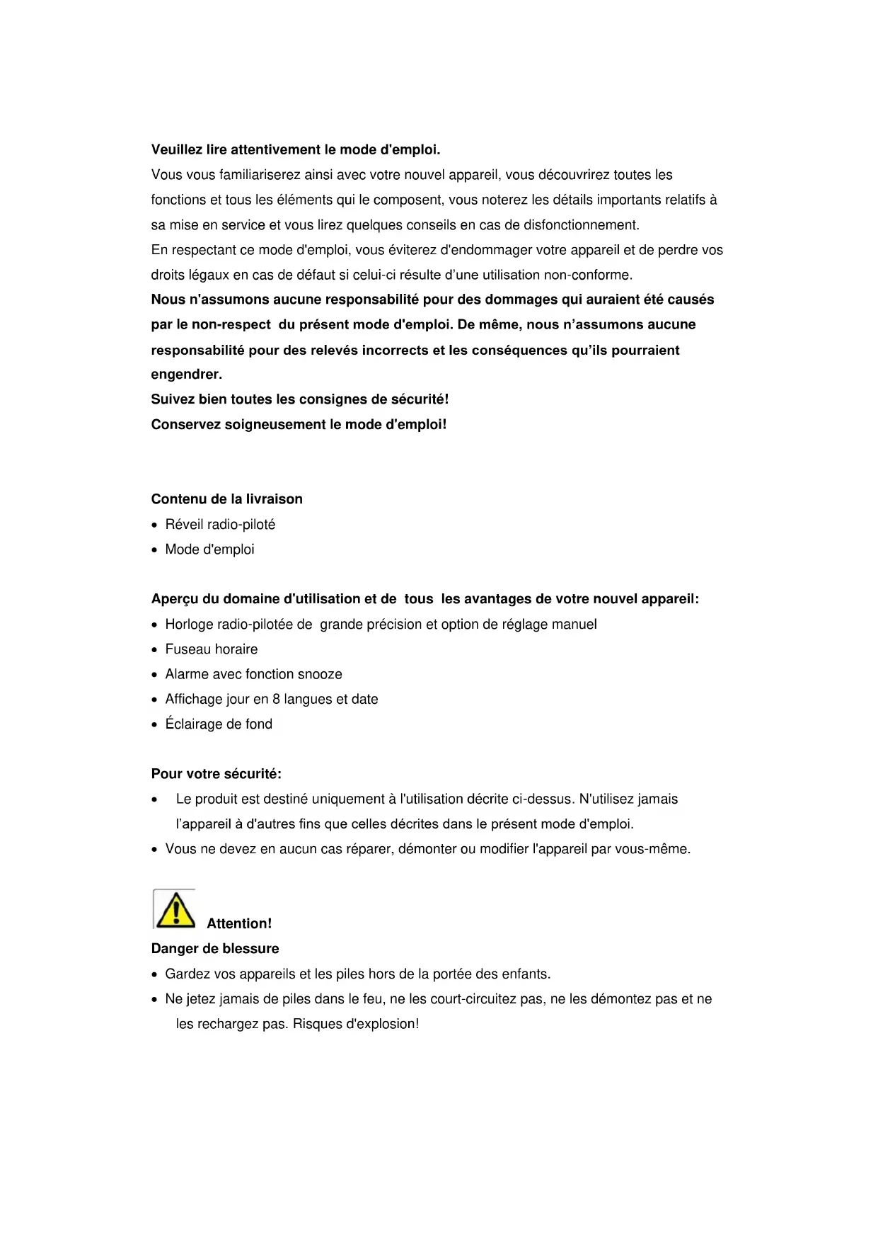 Nous n'assumons aucune responsabilité pour des dommages qui auraient eté causés par le non-respect du present mode d'emploi. De même, nous n'assumons aucune responsabilité pour des relevés incorrects et les conséquences qu'ils pourraient engendrer.
