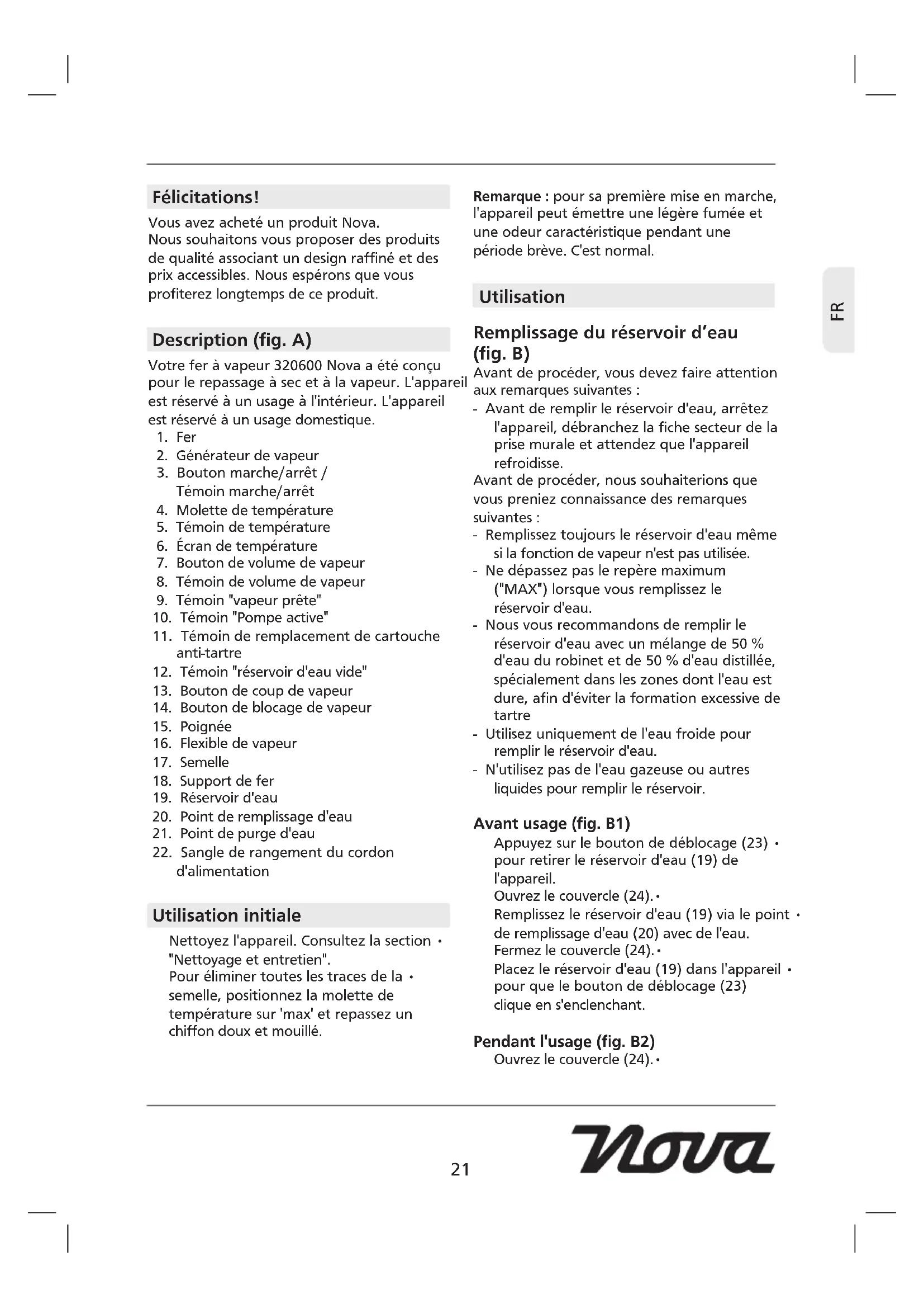 Félicitations! Vous avez acheté un produit Nova. Nous souhaitons vous proposer des produits de qualité associant un design raffiné et des prix accessibles. Nous espérons que vous profiterez longtemps de ce produit. Description (fig. A) Votre fer à vapeur 320600 Nova a été conçu pour le repassage à sec et à la vapeur. L'appareil est réservé à un usage à l'intérieur. L'appareil est réservé à un usage domestique.