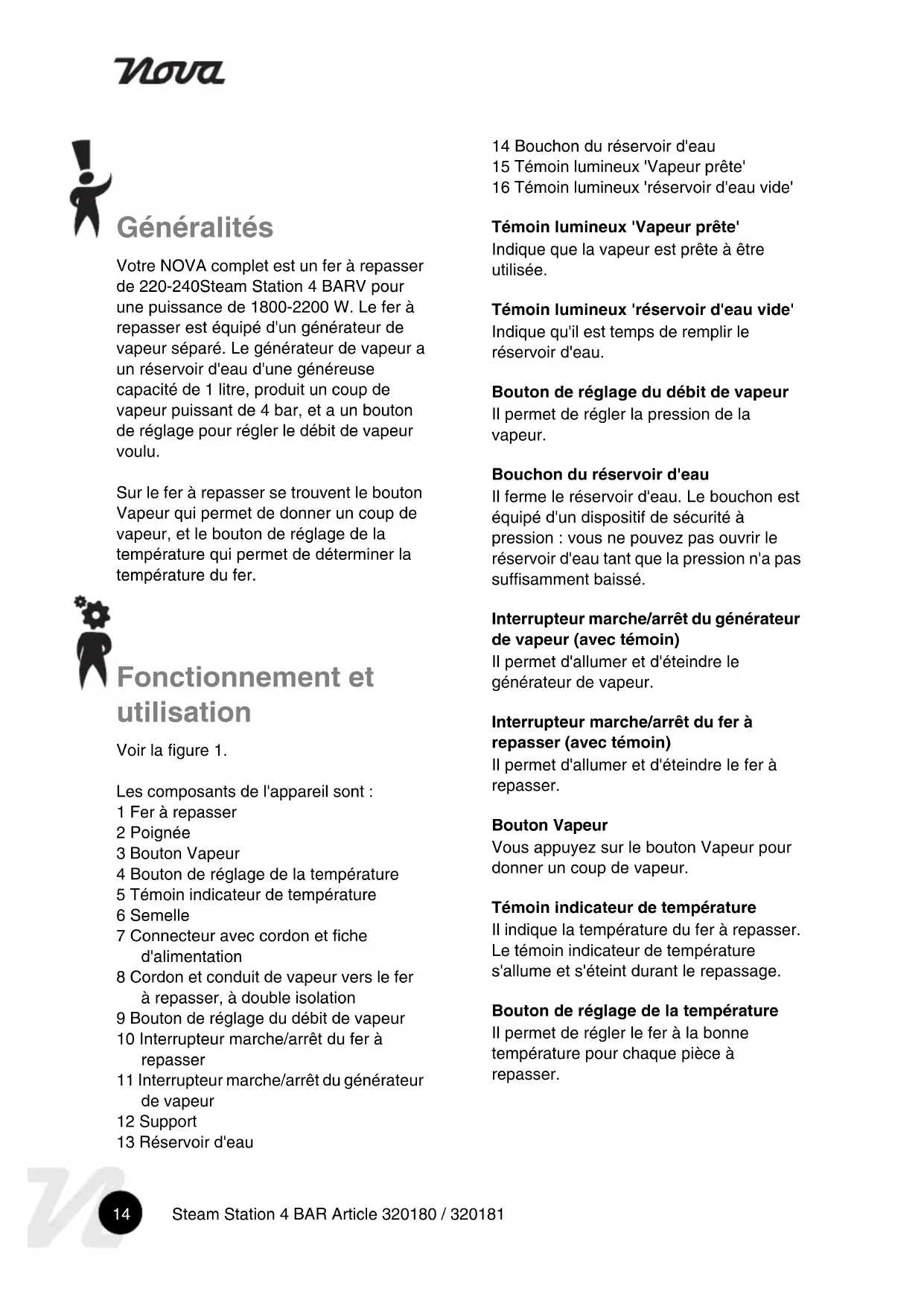 - 2002/96/EC14 Steam Station 4 BAR Article 320180 / 320181 Généralités Votre NOVA complet est un fer à repasser de 220-240Steam Station 4 BARV pour une puissance de 1800-2200 W. Le fer à repasser est équipé d'un générateur de vapeur séparé. Le générateur de vapeur a un réservoir d'eau d'une généreuse capacité de 1 litre, produit un coup de vapeur puissant de 4 bar, et a un bouton de réglage pour régler le débit de vapeur voulu. Sur le fer à repasser se trouvent le bouton Vapeur qui permet de donner un coup de vapeur, et le bouton de réglage de la température qui permet de déterminer la température du fer. Fonctionnement et utilisation Voir la figure 1. Les composants de l'appareil sont : 1 Fer à repasser 2 Poignée 3 Bouton Vapeur 4 Bouton de réglage de la température 5 Témoin indicateur de température 6 Semelle 7 Connecteur avec cordon et fiche d'alimentation 8 Cordon et conduit de vapeur vers le fer à repasser, à double isolation 9 Bouton de réglage du débit de vapeur 10 Interrupteur marche/arrêt du fer à repasser 11 Interrupteur marche/arrêt du générateur de vapeur 12 Support 13 Réservoir d'eau 14 Bouchon du réservoir d'eau 15 Témoin lumineux 'Vapeur prête' 16 Témoin lumineux 'réservoir d'eau vide' Témoin lumineux 'Vapeur prête' Indique que la vapeur est prête à être utilisée. Témoin lumineux 'réservoir d'eau vide' Indique qu'il est temps de remplir le réservoir d'eau. Bouton de réglage du débit de vapeur Il permet de régler la pression de la vapeur. Bouchon du réservoir d'eau Il ferme le réservoir d'eau. Le bouchon est équipé d'un dispositif de sécurité à pression : vous ne pouvez pas ouvrir le réservoir d'eau tant que la pression n'a pas suffisamment baissé. Interrupteur marche/arrêt du générateur de vapeur (avec témoin) Il permet d'allumer et d'éteindre le générateur de vapeur. Interrupteur marche/arrêt du fer à repasser (avec témoin) Il permet d'allumer et d'éteindre le fer à repasser. Bouton Vapeur Vous appuyez sur le bouton Vapeur pour donner un coup de vapeur. Témoin indicateur de température Il indique la température du fer à repasser. Le témoin indicateur de température s'allume et s'éteint durant le repassage. Bouton de réglage de la température Il permet de régler le fer à la bonne température pour chaque pièce à repasser.15 Steam Station 4 BAR Article 320180 / 320181 Avant la première utilisation