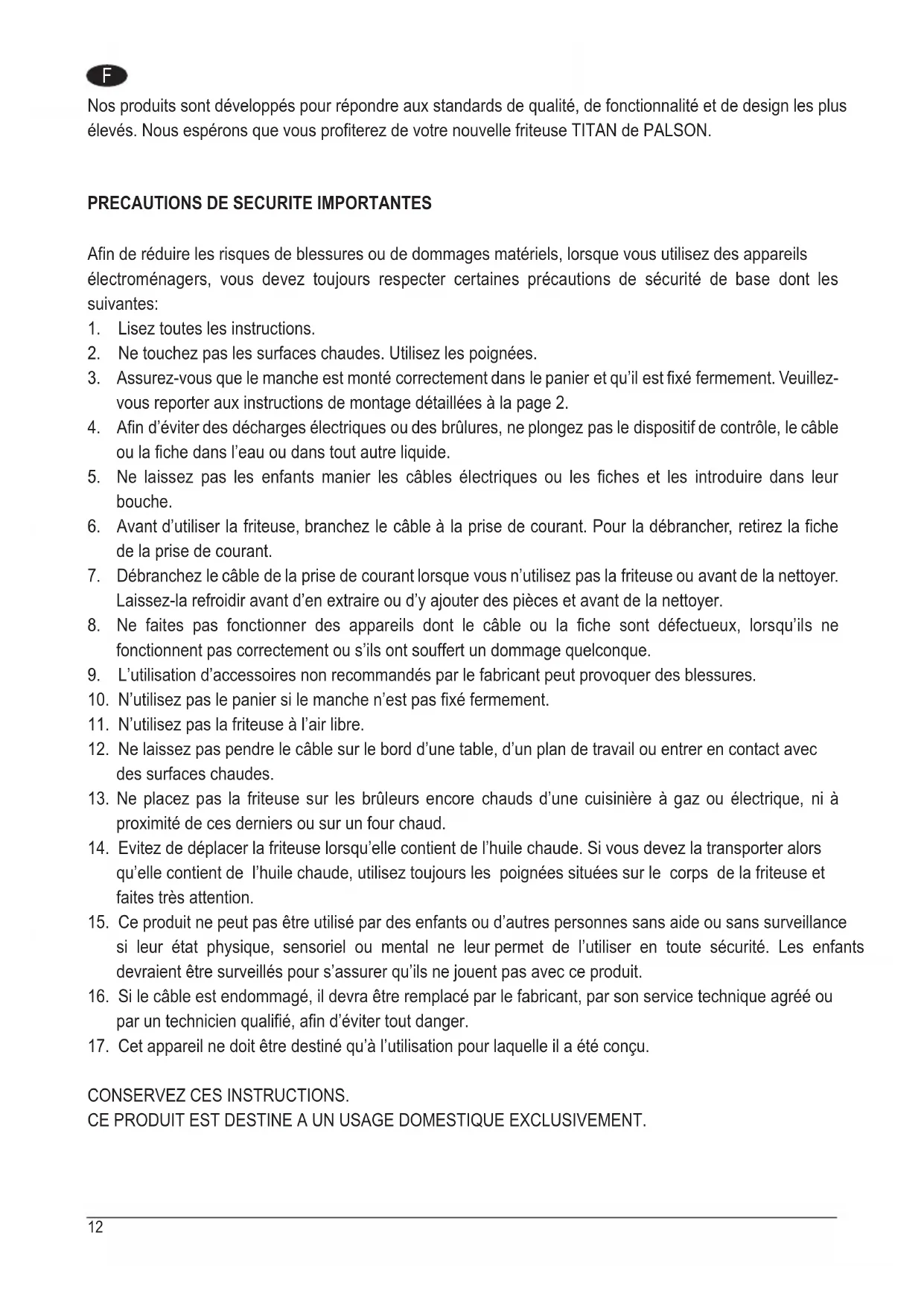 CE PRODUIT EST DESTINE A UN USAGE DOMESTIQUE EXCLUSIVEMENT.