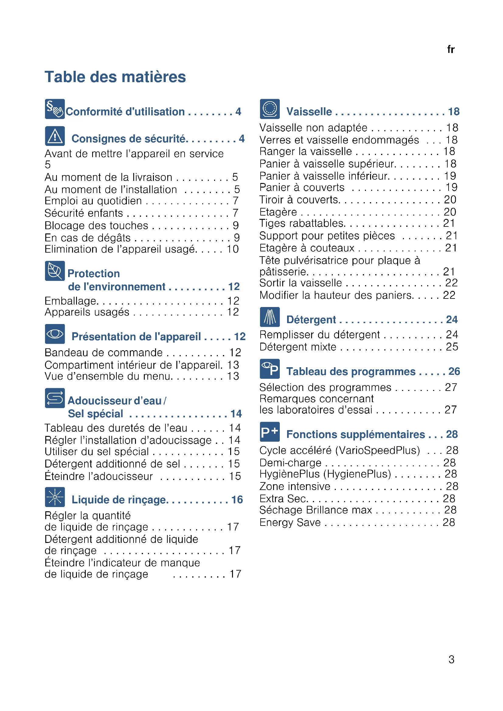 - Présentation de l'appareil . . . . . 12 Bandeau de commande . . . . . . . . . . 12 Compartiment intérieur de l’appareil. 13 Vue d’ensemble du menu. . . . . . . . . 13 + Adoucisseur d’eau / Sel spécial . . . . . . . . . . . . . . . . . 14 Tableau des duretés de l’eau . . . . . . 14 Régler l’installation d’adoucissage . . 14 Utiliser du sel spécial . . . . . . . . . . . . 15 Détergent additionné de sel . . . . . . . 15 Éteindre l’adoucisseur . . . . . . . . . . . 15 , Liquide de rinçage. . . . . . . . . . . 16 Régler la quantité de liquide de rinçage . . . . . . . . . . . . 17 Détergent additionné de liquide de rinçage . . . . . . . . . . . . . . . . . . . . 17 Éteindre l’indicateur de manque de liquide de rinçage . . . . . . . . . 17 - Vaisselle . . . . . . . . . . . . . . . . . . . 18 Vaisselle non adaptée . . . . . . . . . . . . 18 Verres et vaisselle endommagés . . . 18 Ranger la vaisselle . . . . . . . . . . . . . . 18 Panier à vaisselle supérieur. . . . . . . . 18 Panier à vaisselle inférieur. . . . . . . . . 19 Panier à couverts . . . . . . . . . . . . . . . 19 Tiroir à couverts. . . . . . . . . . . . . . . . . 20 Etagère . . . . . . . . . . . . . . . . . . . . . . . 20 Tiges rabattables. . . . . . . . . . . . . . . . 21 Support pour petites pièces . . . . . . . 21 Etagère à couteaux . . . . . . . . . . . . . . 21 Tête pulvérisatrice pour plaque à pâtisserie. . . . . . . . . . . . . . . . . . . . . . 21 Sortir la vaisselle . . . . . . . . . . . . . . . . 22 Modifier la hauteur des paniers. . . . . 22 . Détergent . . . . . . . . . . . . . . . . . . 24 Remplisser du détergent . . . . . . . . . . 24 Détergent mixte . . . . . . . . . . . . . . . . . 25 / Tableau des programmes . . . . . 26 Sélection des programmes . . . . . . . . 27 Remarques concernant les laboratoires d’essai . . . . . . . . . . . 27 0 Fonctions supplémentaires . . . 28 Cycle accéléré (VarioSpeedPlus) . . . 28 Demi-charge . . . . . . . . . . . . . . . . . . . 28 HygiènePlus (HygienePlus) . . . . . . . . 28 Zone intensive . . . . . . . . . . . . . . . . . . 28 Extra Sec. . . . . . . . . . . . . . . . . . . . . . 28 Séchage Brillance max . . . . . . . . . . . 28 Energy Save . . . . . . . . . . . . . . . . . . . 28fr Conformité d’utilisation