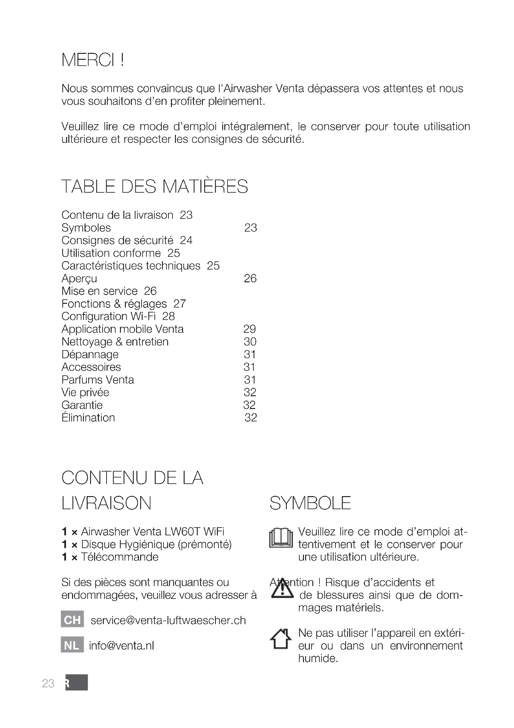 LIVRAISON 1 × Airwasher Venta LW60T WiFi 1 × Disque Hygiénique (prémonté) 1 × Télécommande Si des pièces sont manquantes ou endommagées, veuillez vous adresser à CH service@venta-luftwaescher.ch NL info@venta.nl