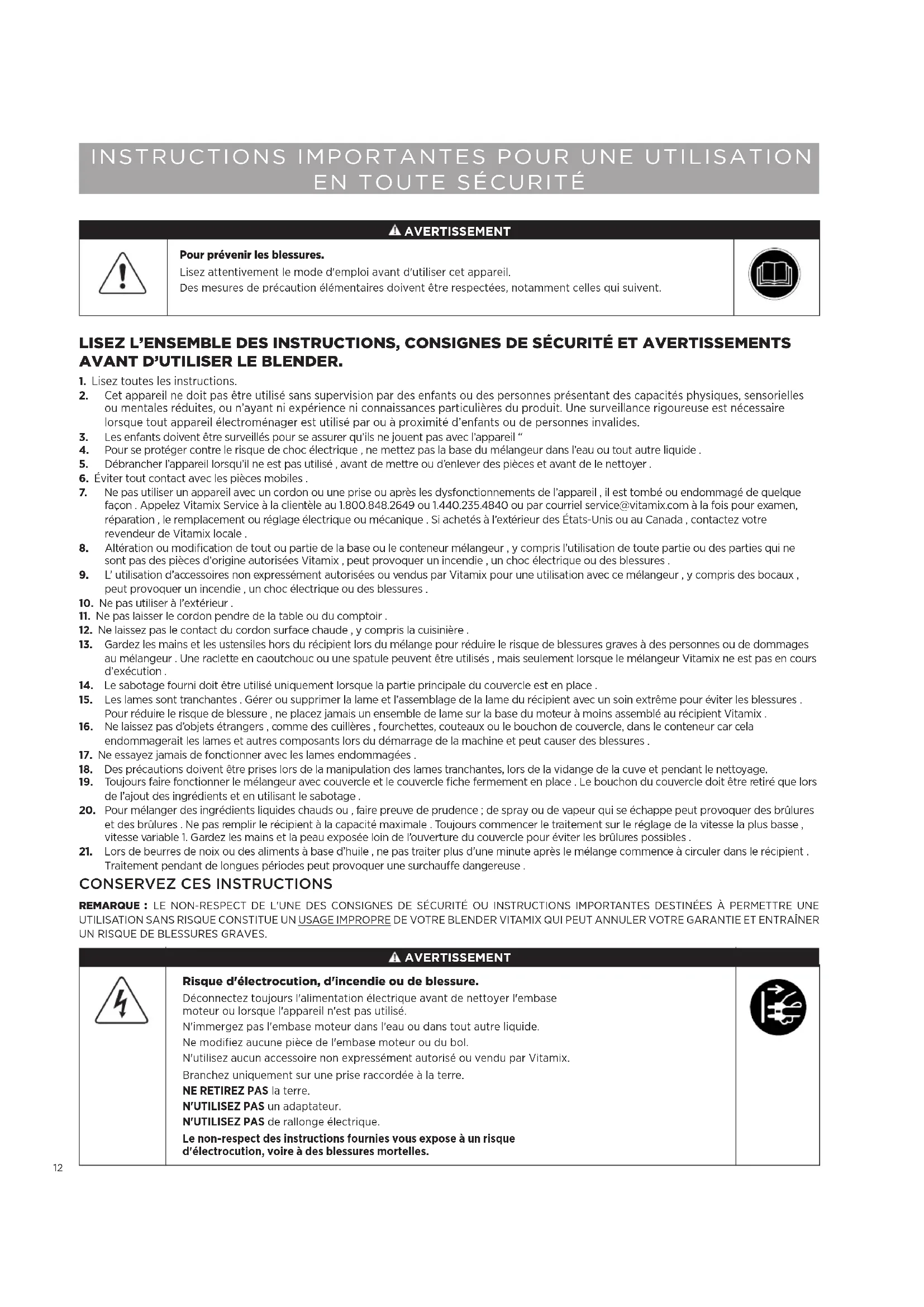 7. Ne pas utiliser un appareil avec un cordon ou une prise ou après les dysfonctionnements de l’appareil , il est tombé ou endommagé de quelque façon . Appelez Vitamix Service à la clientèle au 1.800.848.2649 ou 1.440.235.4840 ou par courriel service@vitamix.com à la fois pour examen, réparation , le remplacement ou réglage électrique ou mécanique . Si achetés à l’extérieur des États-Unis ou au Canada , contactez votre revendeur de Vitamix locale . 8. Altération ou modification de tout ou partie de la base ou le conteneur mélangeur , y compris l’utilisation de toute partie ou des parties qui ne sont pas des pièces d’origine autorisées Vitamix , peut provoquer un incendie , un choc électrique ou des blessures . 9. L’ utilisation d’accessoires non expressément autorisées ou vendus par Vitamix pour une utilisation avec ce mélangeur , y compris des bocaux , peut provoquer un incendie , un choc électrique ou des blessures .10. Ne pas utiliser à l’extérieur .11. Ne pas laisser le cordon pendre de la table ou du comptoir .12. Ne laissez pas le contact du cordon surface chaude , y compris la cuisinière . 13. Gardez les mains et les ustensiles hors du récipient lors du mélange pour réduire le risque de blessures graves à des personnes ou de dommages au mélangeur . Une raclette en caoutchouc ou une spatule peuvent être utilisés , mais seulement lorsque le mélangeur Vitamix ne est pas en cours d’exécution .