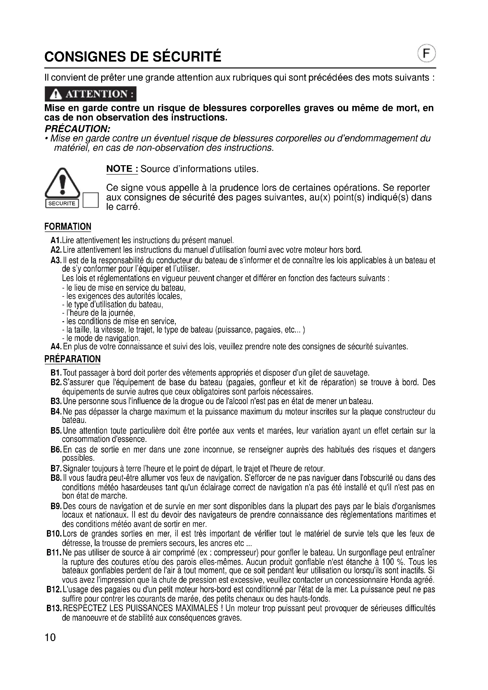 - Mise en garde contre un éventuel risque de blessures corporelles ou d’endommagement du matériel, en cas de non-observation des instructions. NOTE : Source d’informations utiles. Ce signe vous appelle à la prudence lors de certaines opérations. Se reporter aux consignes de sécurité des pages suivantes, au(x) point(s) indiqué(s) dans le carré. FORMATION A1.Lire attentivement les instructions du présent manuel. A2.Lire attentivement les instructions du manuel d’utilisation fourni avec votre moteur hors bord. A3.Il est de la responsabilité du conducteur du bateau de s’informer et de connaître les lois applicables à un bateau et de s’y conformer pour l’équiper et l’utiliser. Les lois et réglementations en vigueur peuvent changer et différer en fonction des facteurs suivants : - le lieu de mise en service du bateau, - les exigences des autorités locales, - le type d’utilisation du bateau, - l’heure de la journée, - les conditions de mise en service, - la taille, la vitesse, le trajet, le type de bateau (puissance, pagaies, etc... ) - le mode de navigation. A4.En plus de votre connaissance et suivi des lois, veuillez prendre note des consignes de sécurité suivantes. PRÉPARATION B1.Tout passager à bord doit porter des vêtements appropriés et disposer d'un gilet de sauvetage. B2.S’assurer que l'équipement de base du bateau (pagaies, gonfleur et kit de réparation) se trouve à bord. Des équipements de survie autres que ceux obligatoires sont parfois nécessaires. B3.Une personne sous l'influence de la drogue ou de l'alcool n'est pas en état de mener un bateau. B4.Ne pas dépasser la charge maximum et la puissance maximum du moteur inscrites sur la plaque constructeur du bateau. B5.Une attention toute particulière doit être portée aux vents et marées, leur variation ayant un effet certain sur la consommation d'essence. B6.En cas de sortie en mer dans une zone inconnue, se renseigner auprès des habitués des risques et dangers possibles. B7.Signaler toujours à terre l’heure et le point de départ, le trajet et l'heure de retour. B8.Il vous faudra peut-être allumer vos feux de navigation. S’efforcer de ne pas naviguer dans l'obscurité ou dans des conditions météo hasardeuses tant qu'un éclairage correct de navigation n'a pas été installé et qu'il n'est pas en bon état de marche. B9.Des cours de navigation et de survie en mer sont disponibles dans la plupart des pays par le biais d'organismes locaux et nationaux. II est du devoir des navigateurs de prendre connaissance des réglementations maritimes et des conditions météo avant de sortir en mer. B10.Lors de grandes sorties en mer, il est très important de vérifier tout le matériel de survie tels que les feux de détresse, la trousse de premiers secours, les ancres etc ... B11.Ne pas utiliser de source à air comprimé (ex : compresseur) pour gonfler le bateau. Un surgonflage peut entraîner la rupture des coutures et/ou des parois elles-mêmes. Aucun produit gonflable n'est étanche à 100 %. Tous les bateaux gonflables perdent de l'air à tout moment, que ce soit pendant leur utilisation ou lorsqu'ils sont inactifs. Si vous avez l'impression que la chute de pression est excessive, veuillez contacter un concessionnaire Honda agréé. B12.L'usage des pagaies ou d'un petit moteur hors-bord est conditionné par l'état de la mer. La puissance peut ne pas suffire pour contrer les courants de marée, des petits chenaux ou des hauts-fonds. B13.RESPECTEZ LES PUISSANCES MAXIMALES ! Un moteur trop puissant peut provoquer de sérieuses difficultés de manoeuvre et de stabilité aux conséquences graves. SECURITE om_T40_2006_D-GB-F.book Page 10 Jeudi, 16. octobre 2008 1:20 1311