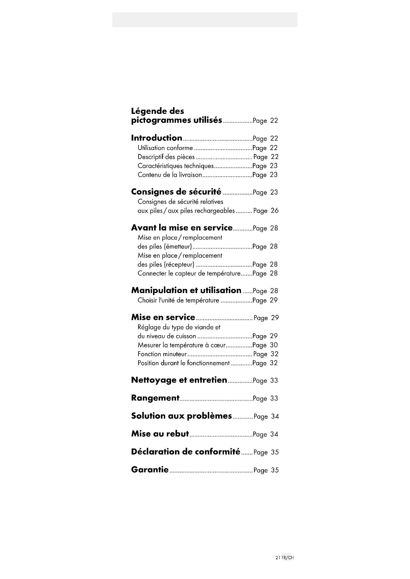sorgfältig produziert und vor Anlieferung gewissenhaft geprüft. Im Falle von Mängeln dieses Produkts stehen Ihnen gegen den Verkäufer des Produkts gesetzliche Rechte zu. Diese gesetzlichen Rechte werden durch unsere im Folgenden dargestellte Garantie nicht ein- geschränkt. Sie erhalten auf dieses Produkt 3 Jahre Garantie ab Kaufdatum. Die Garantiefrist beginnt mit dem Kauf- datum. Bitte bewahren Sie den Original-Kassenbon gut auf. Diese Unterlage wird als Nachweis für den Kauf benötigt. Tritt innerhalb von 3 Jahren ab dem Kaufdatum dieses Produkts ein Material- oder Fabrikationsfehler auf, wird das Produkt von uns – nach unserer Wahl – für Sie kostenlos repariert oder ersetzt. Diese Garantie20 DE/AT/CH verfällt, wenn das Produkt beschädigt, nicht sachge- mäß benutzt oder gewartet wurde. Die Garantieleistung gilt für Material- oder Fabrikati- onsfehler. Diese Garantie erstreckt sich nicht auf Pro- duktteile, die normaler Abnutzung ausgesetzt sind (z. B. Batterien) und daher als Verschleißteile angesehen werden können oder für Beschädigungen an zerbrech- lichen Teilen, z. B. Schalter, Akkus oder die aus Glas gefertigt sind.21 FR/CH Légende des pictogrammes utilisés ..................Page 22 Introduction ..........................................Page 22 Utilisation conforme ...................................Page 22 Descriptif des pièces .................................. Page 22 Caractéristiques techniques .......................Page 23 Contenu de la livraison ..............................Page 23 Consignes de sécurité ..................Page 23 Consignes de sécurité relatives aux piles / aux piles rechargeables .......... Page 26 Avant la mise en service ............Page 28 Mise en place / remplacement des piles (émetteur) ....................................Page 28 Mise en place / remplacement des piles (récepteur) ..................................Page 28 Connecter le capteur de température .......Page 28 Manipulation et utilisation ......Page 28 Choisir l'unité de température ...................Page 29 Mise en service .................................. Page 29 Réglage du type de viande et du niveau de cuisson .................................Page 29 Mesurer la température à cœur ................Page 30 Fonction minuteur ....................................... Page 32 Position durant le fonctionnement .............Page 32 Nettoyage et entretien ...............Page 33 Rangement............................................Page 33 Solution aux problèmes ............ Page 34 Mise au rebut ......................................Page 34 Déclaration de conformité ....... Page 35 Garantie .................................................. Page 3522 FR/CH Légende des pictogrammes utilisés Respecter les avertissements et consignes de sécurité ! Le produit répond aux directives euro- péennes appliquées spécifiquement pour ce type de produit Courant continu UTILISATION ALIMENTAIRE! Les propriétés de goût et d'odeur ne sont pas influencées par ce produit. °C Celsius °F Fahrenheit Thermomètre de cuisson électronique Introduction Nous vous félicitons pour l‘achat de votre nouveau produit. Vous avez opté pour un produit de grande qualité. Le mode d‘emploi fait partie intégrante de ce produit. Il contient des indications importantes pour la sécurité, l’utilisation et la mise au rebut. Veuillez lire consciencieusement toutes les indications d‘utilisation et de sécurité du produit. Ce produit doit uniquement être utilisé conformément aux instructions et dans les domaines d‘application spécifiés. Lors d‘une cession à tiers, veuillez également remettre tous les documents. Utilisation conforme Le produit est conçu pour mesurer et surveiller la tem- pérature à cœur de plats de poisson, viande de bœuf, veau, porc, agneau, dinde, poulet et hamburgers. Ce produit est uniquement destiné à un usage domestique et privé. Le produit n'est pas destiné à une utilisation commerciale ou à d'autres domaines d'utilisation. Descriptif des pièces Récepteur