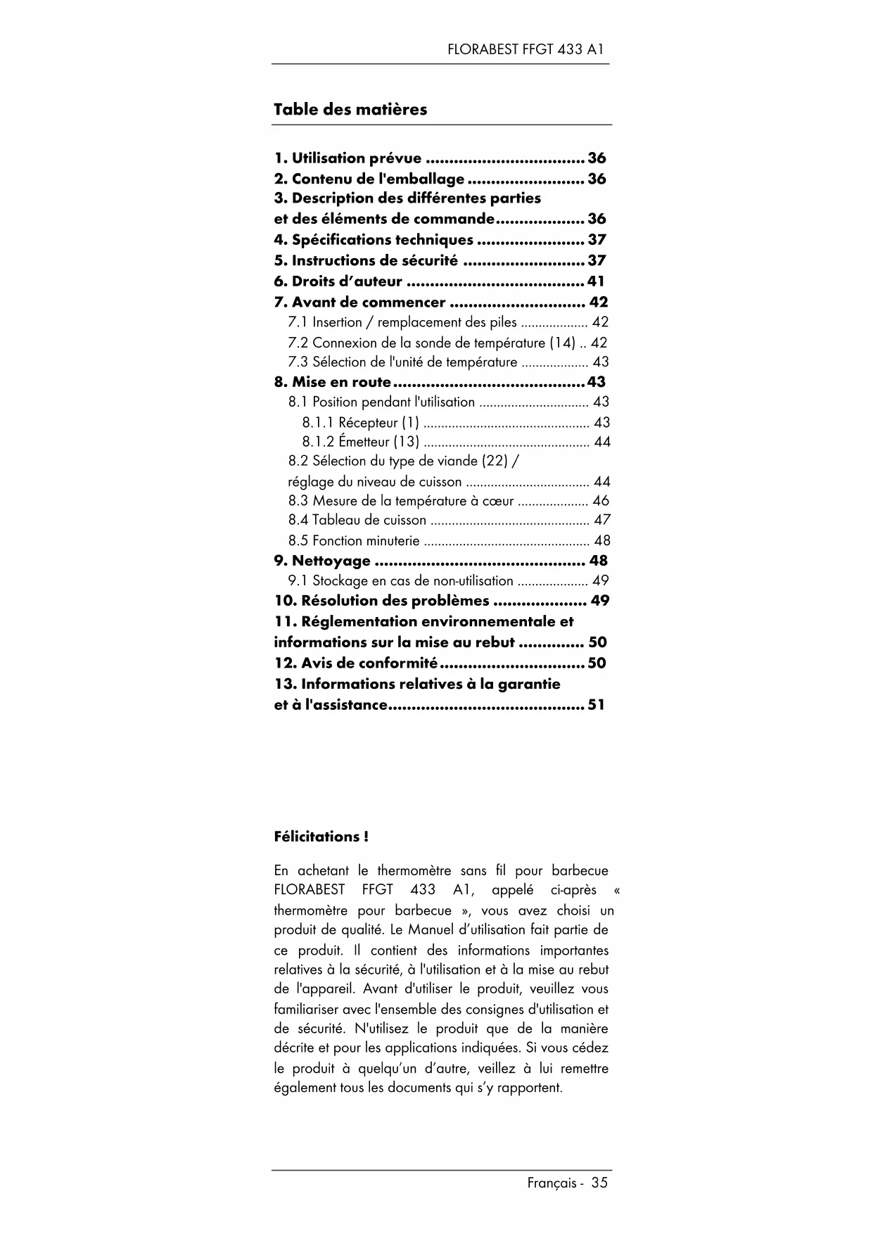 Félicitations ! En achetant le thermomètre sans fil pour barbecue FLORABEST FFGT 433 A1, appelé ci-après « le thermomètre pour barbecue », vous avez choisi un produit de qualité. Le Manuel d’utilisation fait partie de ce produit. Il contient des informations importantes relatives à la sécurité, à l'utilisation et à la mise au rebut de l'appareil. Avant d'utiliser le produit, veuillez vous familiariser avec l'ensemble des consignes d'utilisation et de sécurité. N'utilisez le produit que de la manière décrite et pour les applications indiquées. Si vous cédez le produit à quelqu’un d’autre, veillez à lui remettre également tous les documents qui s’y rapportent.FLORABEST FFGT 433 A1