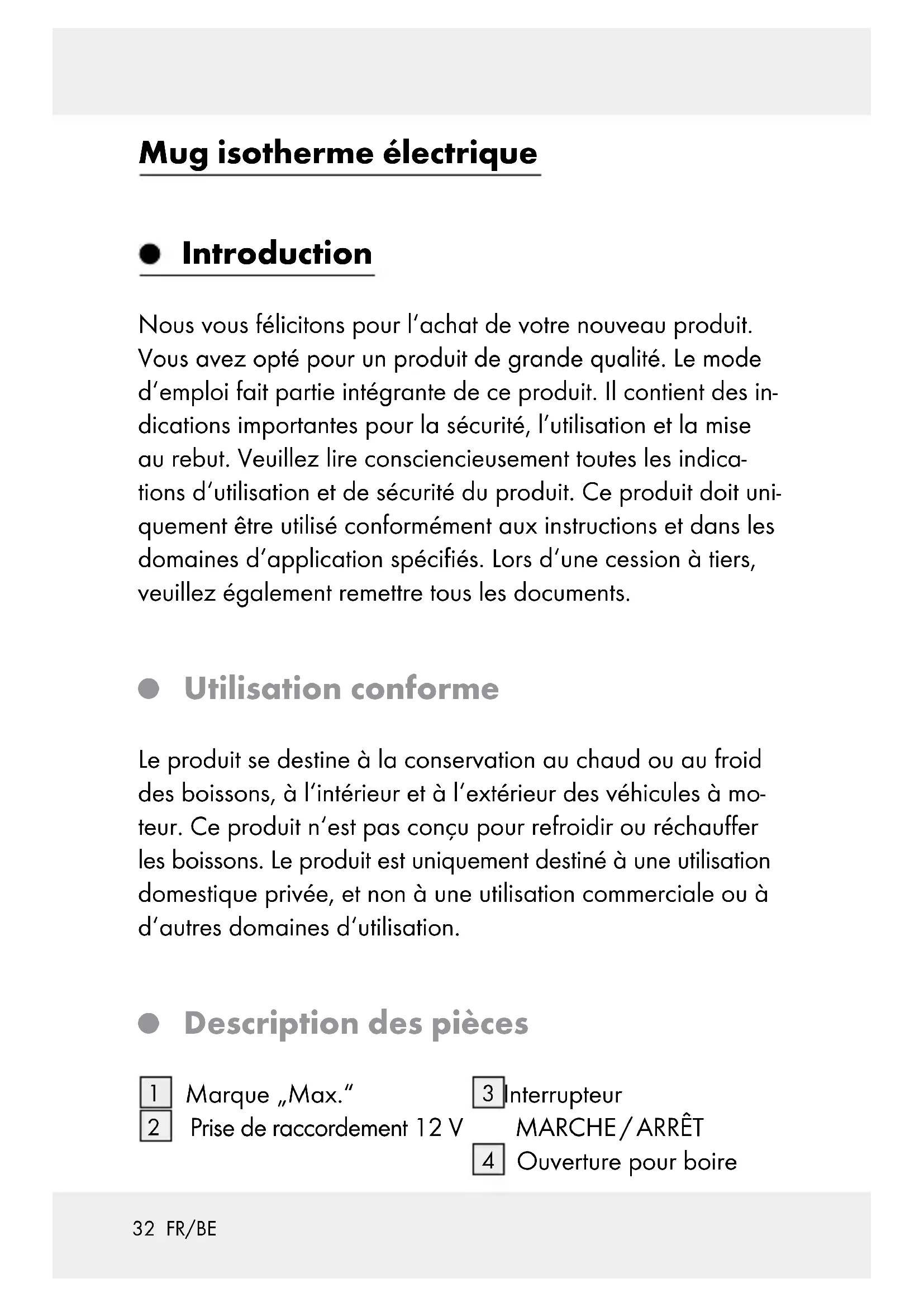 , afin qu‘aucun liquide ne puisse s‘en échapper. Ne jamais réchauffer le contenu du go- belet en utilisant une source de chaleur externe. Ne jamais laisser le produit sans surveil- lance, alors qu‘il se trouve alimenté par une source de tension. Ne jamais faire fonctionner le produit à l‘état vide.39 FR/BE Ne jamais remplir le produit de boissons gazeuses. Il existe autrement un risque de surpression. Évitez de répandre le contenu de votre gobelet sur la prise de raccordement 12 V