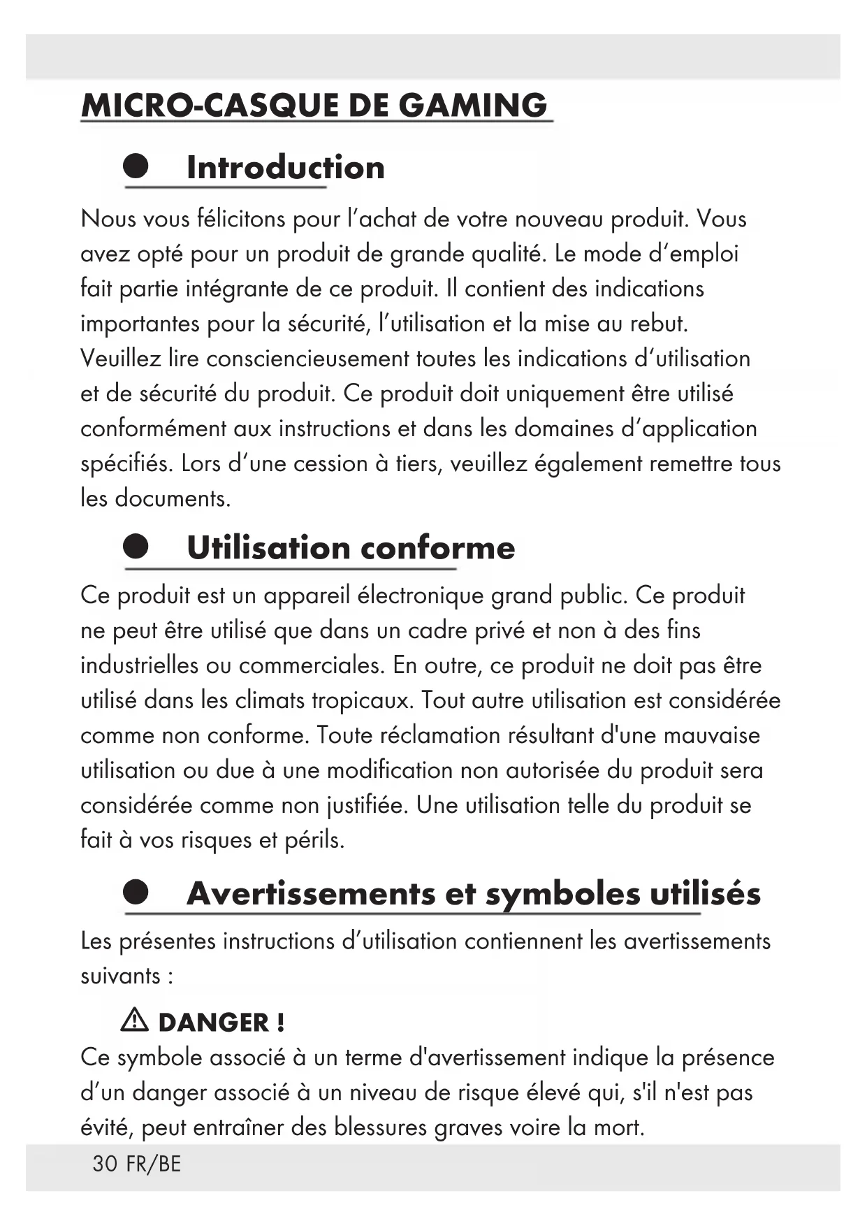 Introduction Nous vous félicitons pour l’achat de votre nouveau produit. Vous avez opté pour un produit de grande qualité. Le mode d‘emploi fait partie intégrante de ce produit. Il contient des indications importantes pour la sécurité, l’utilisation et la mise au rebut. Veuillez lire consciencieusement toutes les indications d‘utilisation et de sécurité du produit. Ce produit doit uniquement être utilisé conformément aux instructions et dans les domaines d‘application spécifiés. Lors d‘une cession à tiers, veuillez également remettre tous les documents. Utilisation conforme Ce produit est un appareil électronique grand public. Ce produit ne peut être utilisé que dans un cadre privé et non à des fins industrielles ou commerciales. En outre, ce produit ne doit pas être utilisé dans les climats tropicaux. Tout autre utilisation est considérée comme non conforme. Toute réclamation résultant d'une mauvaise utilisation ou due à une modification non autorisée du produit sera considérée comme non justifiée. Une utilisation telle du produit se fait à vos risques et périls. Avertissements et symboles utilisés Les présentes instructions d’utilisation contiennent les avertissements suivants: m DANGER! Ce symbole associé à un terme d'avertissement indique la présence d’un danger associé à un niveau de risque élevé qui, s'il n'est pas évité, peut entraîner des blessures graves voire la mort.31 FR/BE m AVERTISSEMENT! Ce symbole associé à un terme d'avertissement indique la présence d’un danger associé à un niveau de risque moyen qui, s'il n'est pas évité, peut entraîner des blessures graves voire la mort. m ATTENTION! Ce symbole associé à un terme d'avertissement indique la présence d’un danger associé à un faible niveau de risque qui, s'il n'est pas évité, peut entraîner des blessures mineures ou modérées. REMARQUE: Ce symbole associé à un terme d’avertissement fournit des informations complémentaires utiles. Faites attention lorsque vous utilisez ces écouteurs. L'écoute à fort volume pendant des périodes prolongées risque d’endommager votre ouïe. Avant d'utiliser les écouteurs, réglez le volume au niveau le plus bas. Avis de marques déposées USB
