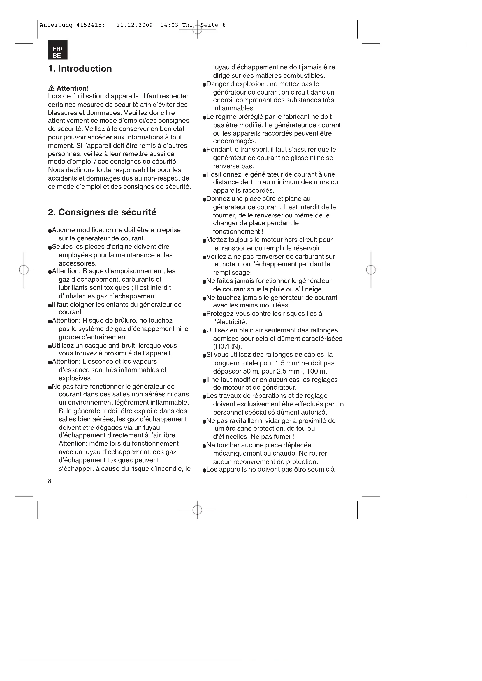 Aucune modification ne doit être entreprise sur le générateur de courant. Seules les pièces d’origine doivent être employées pour la maintenance et les accessoires. Attention: Risque d’empoisonnement, les gaz d’échappement, carburants et lubrifiants sont toxiques ; il est interdit d’inhaler les gaz d’échappement. Il faut éloigner les enfants du générateur de courant Attention: Risque de brûlure, ne touchez pas le système de gaz d’échappement ni le groupe d’entraînement Utilisez un casque anti-bruit, lorsque vous vous trouvez à proximité de l’appareil. Attention: L’essence et les vapeurs d’essence sont très inflammables et explosives. Ne pas faire fonctionner le générateur de courant dans des salles non aérées ni dans un environnement légèrement inflammable. Si le générateur doit être exploité dans des salles bien aérées, les gaz d’échappement doivent être dégagés via un tuyau d’échappement directement à l’air libre. Attention: même lors du fonctionnement avec un tuyau d’échappement, des gaz d’échappement toxiques peuvent s’échapper. à cause du risque d’incendie, le tuyau d’échappement ne doit jamais être dirigé sur des matières combustibles. Danger d’explosion : ne mettez pas le générateur de courant en circuit dans un endroit comprenant des substances très inflammables. Le régime préréglé par le fabricant ne doit pas être modifié. Le générateur de courant ou les appareils raccordés peuvent être endommagés. Pendant le transport, il faut s’assurer que le générateur de courant ne glisse ni ne se renverse pas. Positionnez le générateur de courant à une distance de 1 m au minimum des murs ou appareils raccordés. Donnez une place sûre et plane au générateur de courant. Il est interdit de le tourner, de le renverser ou même de le changer de place pendant le fonctionnement ! Mettez toujours le moteur hors circuit pour le transporter ou remplir le réservoir. Veillez à ne pas renverser de carburant sur le moteur ou l’échappement pendant le remplissage. Ne faites jamais fonctionner le générateur de courant sous la pluie ou s’il neige. Ne touchez jamais le générateur de courant avec les mains mouillées. Protégez-vous contre les risques liés à l’électricité. Utilisez en plein air seulement des rallonges admises pour cela et dûment caractérisées (H07RN). Si vous utilisez des rallonges de câbles, la longueur totale pour 1,5 mm