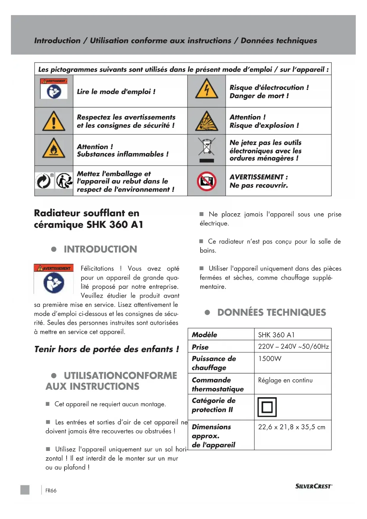 Modèle SHK 360 A1 Prise 220V – 240V ~50/60Hz Puissance de chauffage 1500W Commande thermostatique Réglage en continu Catégorie de protection II Dimensions approx. de l'appareil 22,6 x 21,8 x 35,5 cm AVERTISSEMENT Introduction / Utilisation conforme aux instructions / Données techniques Les pictogrammes suivants sont utilisés dans le présent mode d’emploi / sur l‘appareil : AVERTISSEMENT Lire le mode d'emploi ! Risque d'électrocution ! Danger de mort ! Respectez les avertissements et les consignes de sécurité ! Attention ! Risque d'explosion ! Attention ! Substances inflammables ! Ne jetez pas les outils électroniques avec les ordures ménagères ! Mettez l'emballage et l'appareil au rebut dans le respect de l'environnement !