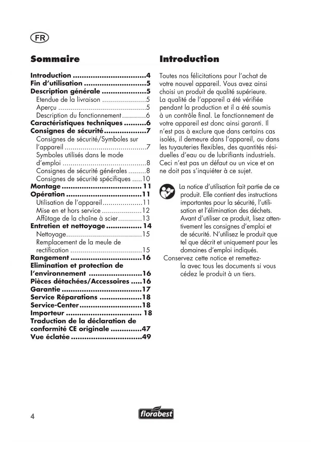 - Introduction Toutes nos félicitations pour l’achat de votre nouvel appareil. Vous avez ainsi choisi un produit de qualité supérieure. La qualité de l’appareil a été vériée pendant la production et il a été soumis à un contrôle nal. Le fonctionnement de votre appareil est donc ainsi garanti. Il n’est pas à exclure que dans certains cas isolés, il demeure dans l’appareil, ou dans les tuyauteries exibles, des quantités rési- duelles d’eau ou de lubriants industriels. Ceci n’est pas un défaut ou un vice et on ne doit pas s’inquiéter à ce sujet. La notice d’utilisation fait partie de ce produit. Elle contient des instructions importantes pour la sécurité, l’utili- sation et l’élimination des déchets. Avant d’utiliser ce produit, lisez atten- tivement les consignes d’emploi et de sécurité. N’utilisez le produit que tel que décrit et uniquement pour les domaines d’emploi indiqués. Conservez cette notice et remettez- la avec tous les documents si vous cédez le produit à un tiers. Sommaire Introduction p. 4