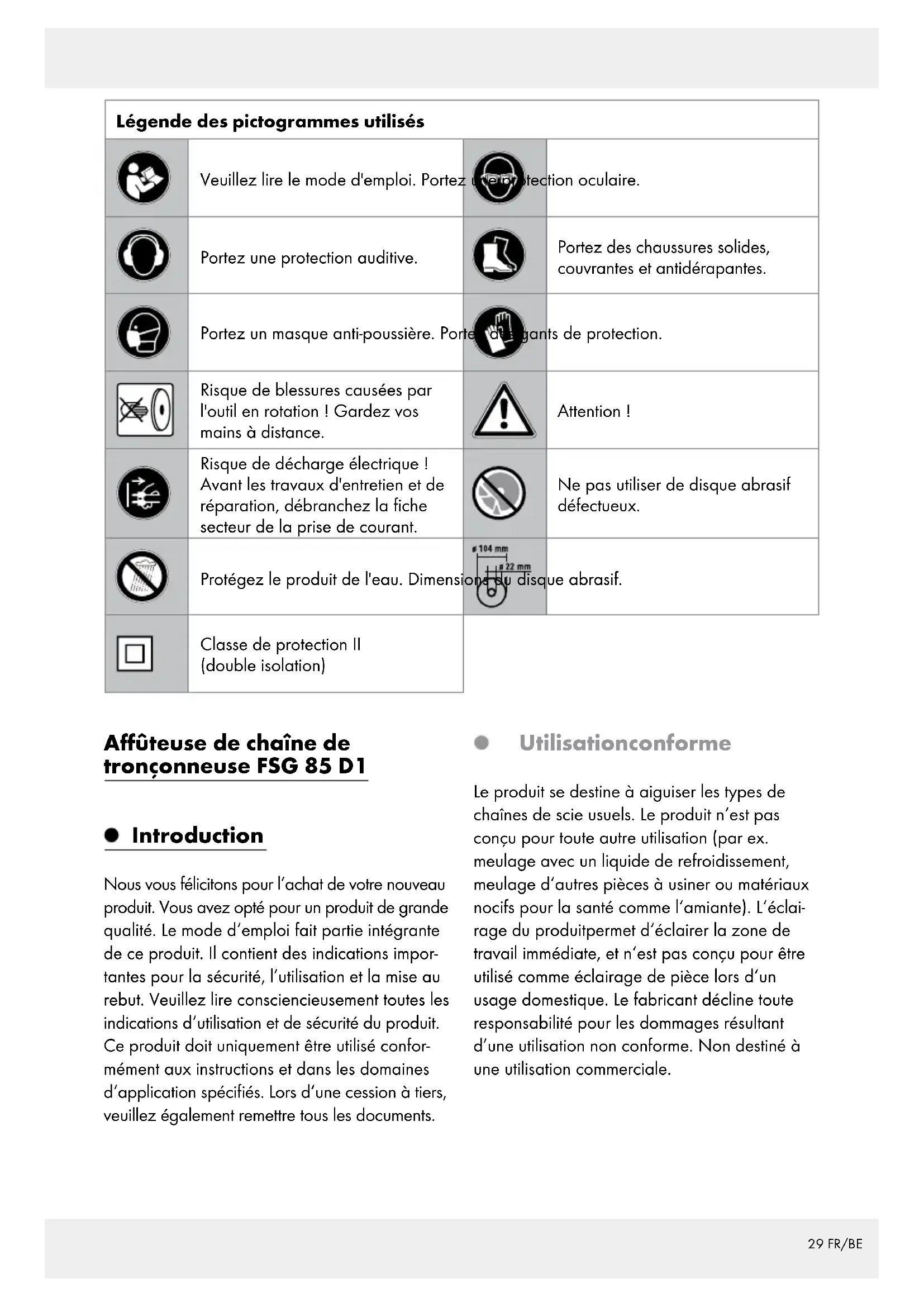 électrique à un électricien qualifié Cet outil électrique est conforme aux consignes de sécurité en vigueur. Les répa- rations doivent uniquement être effectuées par un électricien qualifié utilisant des pièces de rechange d’origine, car des accidents peuvent se produire. Malgré la volonté d‘élaboration de mesures de protection et de sécurisation sûres, les risques restants suivants continuent à exister : Le disque de ponçage continue à fonctionner après que l‘outil ait été mis à l‘arrêt. Risque de blessures. Consignes de sécurité complémentaires Raccordez uniquement le produit à une prise électrique dotée d‘un dispositif à courant différentiel résiduel (interrupteur FI) avec un courant différentiel mesuré ne dépassant pas 30 mA.33 FR/BE Tenir à distance du disque abrasif et de la chaîne de scie le câble secteur ainsi que les rallonges. En cas de dommage ou de sec- tionnement, débranchez immédiatement la fiche secteur. Ne pas toucher le câble, avant qu‘il soit débranché du courant sec- teur. Risque de décharge électrique ! Avant d‘utiliser le disque abrasif, soumet- tez-le à un examen visuel. N‘utilisez pas de disques abrasifs présen- tant des éclats, des fissures ou d‘autres dommages. Remplacez un disque abrasif usé. Ne jamais faire fonctionner le produit sans vitre de protection oculaire. Ne pas travailler avec le produit, lorsque vous êtes fatigué, ou sous l‘emprise de mé- dicaments ou de drogues. Toujours observer une pause dans votre travail en temps utile. Ne pas utiliser le produit dans un environ- nement explosif ou à un endroit susceptible de provoquer des étincelles, un incendie, des explosions, etc. Le non respect de cette consigne entraîne un risque d‘incendie ou d‘explosion. Lors de travaux laissant émaner de la pous- sière, assurez-vous que les orifices d‘aéra- tion sont dégagés. Gardez vos mains à distance du disque abrasif et des dents de chaîne, lorsque le produit fonctionne. Ne pas déplacer la chaîne à scie avec les mains. Risque de blessures. Ne jamais laisser ses doigts entre le disque abrasif et le plateau tournant ou entre le disque abrasif et la vitre de protection. Risque de coincement. La chaîne de scie devient chaude lors du meulage. Ne pas toucher la zone à usiner, il existe un risque de brûlures. Utilisez uniquement les disques abrasifs recommandés par le fabricant. Ne pas utiliser de lames de scie. Éteignez le produit, et débranchez la fiche secteur - afin de débloquer un outil insérable bloqué, - lorsque le câble secteur est endommagé ou empêtré, - en cas de bruits inhabituels. Avant la mise en service Remarque : Veuillez retirer entièrement les matériaux composant l‘emballage. Lors de l‘utilisation, l‘opérateur doit travail- ler à proximité du produit, afin d‘éviter tout étirement corporel inutile, résultant en une posture imprudente. Montage Remarque : Toujours fixer le produit avec les vis fournies (M10 x 60). Veuillez conserver un espace suffisant pour travailler et assurer la sécurité des autres personnes. Toujours fixer le produit à la surface de tra- vail avec des vis de longueur et d‘épaisseur suffisantes, afin de ne pas perdre le contrôle du produit. Installation du produit (voir ill. B) - Épaisseur du bord de table à utiliser : 15–30 mm - Diamètre de perçage : 10,5 mm - Taille de vis : M10 Positionnez le produit sur la surface de tra- vail