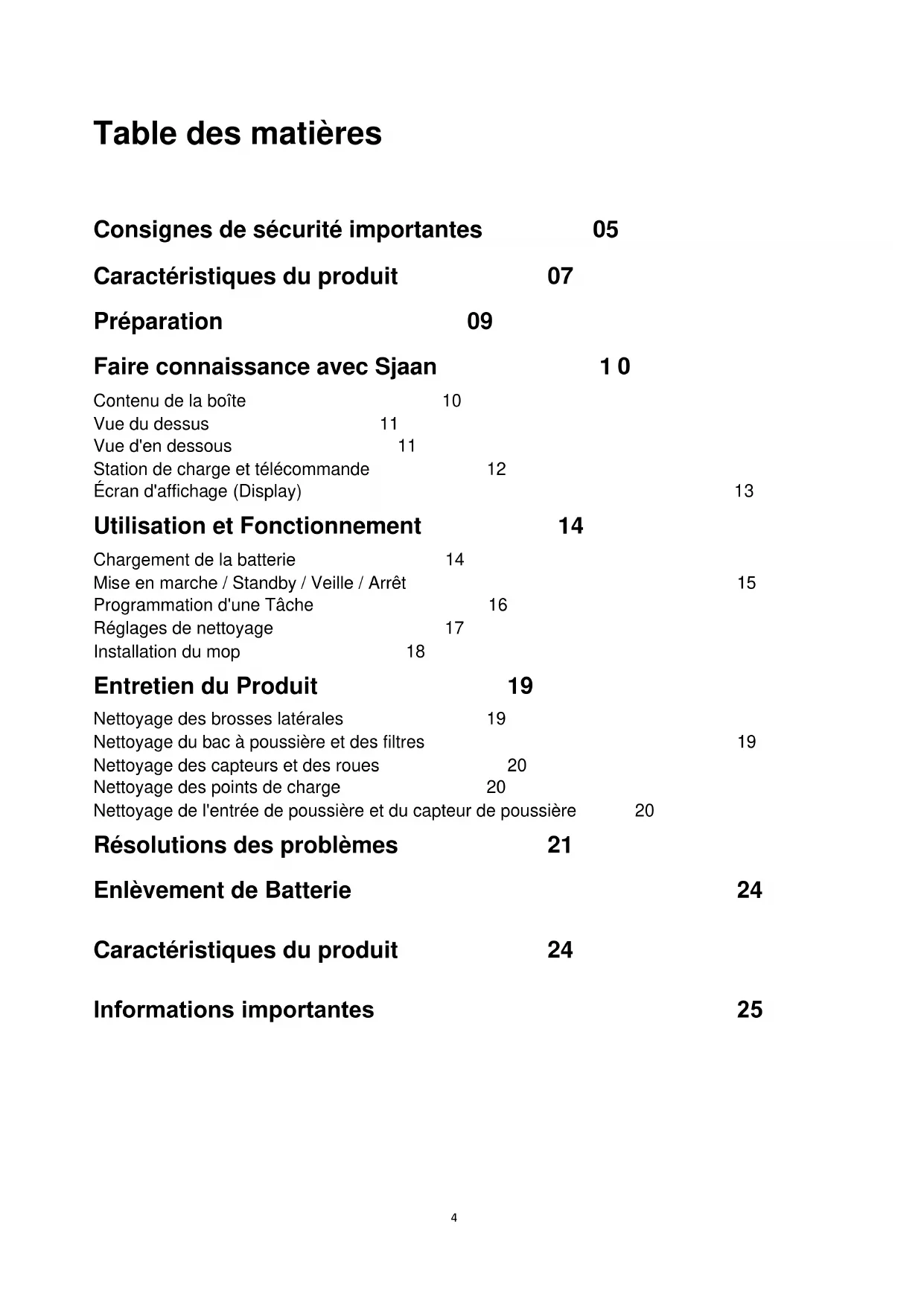 Your Robot Brand12 Cher client, Nous vous remercions d'avoir acheté ce Robot Aspirateur Zoef. Nous espérons que vous apprécierez ce produit et qu'il deviendra une ressource indispensable dans votre foyer. Ce Robot Zoef est facile à utiliser. Cependant, il est important de lire attentivement ce manuel avant d'utiliser le Robot Zoef. Astuces. Utilisez fréquemment l'aspirateur pour obtenir les meilleurs résultats. Après chaque nettoyage, videz le récipient à poussière et nettoyez les filtres. Pour un résultat optimal, nettoyez régulièrement les brosses latérales. Enlevez les poils et la saleté qui se sont accumulés autour des brosses. La sécurité d'abord ! Assurez-vous de bien comprendre ce manuel avant d'allumer l'appareil. Avant d'utiliser l'aspirateur Robot Zoef pour la première fois, lisez attentivement toutes les consignes de sécurité.34 Table des matières Consignes de sécurité importantes 05 Caractéristiques du produit 07 Préparation 09 Faire connaissance avec Sjaan 10 Contenu de la boîte 10 Vue du dessus 11 Vue d'en dessous 11 Station de charge et télécommande 12 Écran d'affichage (Display) 13 Utilisation et Fonctionnement 14 Chargement de la batterie 14 Mise en marche / Standby / Veille / Arrêt 15 Programmation d'une Tâche 16 Réglages de nettoyage 17 Installation du mop 18 Entretien du Produit 19 Nettoyage des brosses latérales 19 Nettoyage du bac à poussière et des filtres 19 Nettoyage des capteurs et des roues 20 Nettoyage des points de charge 20 Nettoyage de l'entrée de poussière et du capteur de poussière 20 Résolutions des problèmes 21 Enlèvement de Batterie 24 Caractéristiques du produit 24 Informations importantes 255 Consignes de Sécurité importantes : Soyez toujours prudent lorsque vous utilisez votre Robot Aspirateur Zoef. Pour réduire les risques de dommages et de blessures, lisez attentivement les consignes de sécurité et respectez les mesures de sécurité lors de l'installation, de l'utilisation et de l'entretien de l'appareil ! Avant de procéder au déballage, veuillez lire attentivement les instructions de sécurité et les précautions de sécurité suivantes. Conservez ce manuel pour référence future si nécessaire. Sécurité : - Ce produit est destiné à un usage intérieur uniquement. - Utilisez uniquement notre adaptateur d'origine fourni pour charger le Robot Zoef. Cela évitera d'endommager le produit. L'utilisation de tout autre adaptateur annulera immédiatement la garantie. - Ne pas démonter le Robot Zoef. - Ne pas vaporiser ou immerger le Robot Zoef ou l'adaptateur dans l'eau ou d'autres liquides. - N'utilisez pas le Robot Zoef sur des sols mouillés ou dans des endroits où il risque d'entrer en contact avec de l'eau. - N'utilisez pas le Robot Zoef dans des pièces humides, comme la salle de bains. - N'aspirez pas de substances inflammables ou de cendres avant qu'elles ne soient complètement refroidies. - N'utilisez pas le Robot Zoef à proximité d'endroits dangereux tels que des feux ouverts ou piscine, ou près d'objets enflammés (comme des bougies ou des cigarettes) - Faites attention à ne pas endommager le cordon d'alimentation, cela pourrait provoquer un choc électrique. Mise en garde : - N'utilisez jamais le Robot Zoef si la fiche, le cordon d'alimentation, l'adaptateur secteur ou le robot lui-même est endommagé. - N'essayez jamais de réparer le Robot Zoef vous-même. Cela entraînera la perte de la garantie. - Le Robot Zoef ne peut pas être utilisé par des personnes (y compris les enfants) ayant des capacités physiques, sensorielles et/ou mentales réduites, ou par des personnes manquant d'expérience et/ou de connaissances, à moins qu'une personne responsable de leur sécurité ne supervise ou ne leur ait expliqué comment le Robot Zoef doit être utilisé. - Ne touchez jamais le Robot Zoef, le cordon ou l'adaptateur lorsque vos mains sont mouillées. - Tenir les cheveux, les différentes parties du corps et les vêtements amples à l'écart de la brosse et des autres parties mobiles du Robot Zoef. - Le Robot Zoef est uniquement destiné au nettoyage des sols. Ne pas nettoyer les chaises, les tables ou les escaliers. - Le Robot Zoef n'est pas un jouet pour enfants. Les jeunes enfants et les animaux6 domestiques doivent être sous surveillance lorsque le Robot Zoef est en service. - Ne laissez pas d'enfants et/ou d'animaux domestiques se tenir debout ou assis sur le Robot Zoef. - Assurez-vous que tous les objets fragiles et non attachés, comme les vases, les vêtements, le papier, la télécommande, etc. soient retirés du sol. - Veillez à ce que le Robot Zoef ne soit pas pris dans les cordons des stores ou rideaux, cordons d'alimentation ou autres câbles. Cela peut conduire à des situations dangereuses. Lorsque le Robot Zoef passe sur un cordon d'alimentation et l'entraîne avec lui, l'objet peut chuter ou tomber d'une table ou d'une armoire. - N'utilisez pas le Robot Zoef pour aspirer des éclats de verre et autres objets pointus. Cela peut endommager le Robot. - Toujours débrancher le Robot Zoef lorsqu'il se comporte anormalement ou dégage une odeur étrange, ou lorsqu'une situation dangereuse se produit. - Avertir toute personne se trouvant dans la pièce où le Robot Zoef travaille pour éviter que celle-ci ne trébuche sur le Robot Zoef. - Le Robot Zoef n'est pas en mesure de franchir un seuil supérieur à 10 mm. - Le Robot Zoef ne fonctionne que dans une température ambiante comprise entre 5 et 40 degrés Celsius.7 Caractéristiques du Produit Aspiration forte et contrôle intelligent de l'aspiration Forte puissance d'aspiration : Grâce à la forte puissance d'aspiration de ce Robot Aspirateur, même les plus petites particules de poussière sur le sol sont aspirées à fond ! Contrôle intelligent de l'aspiration : Ce Robot Aspirateur est capable d'ajuster automatiquement sa puissance d'aspiration aux différentes surfaces. Cela permet non seulement de rendre l'aspir