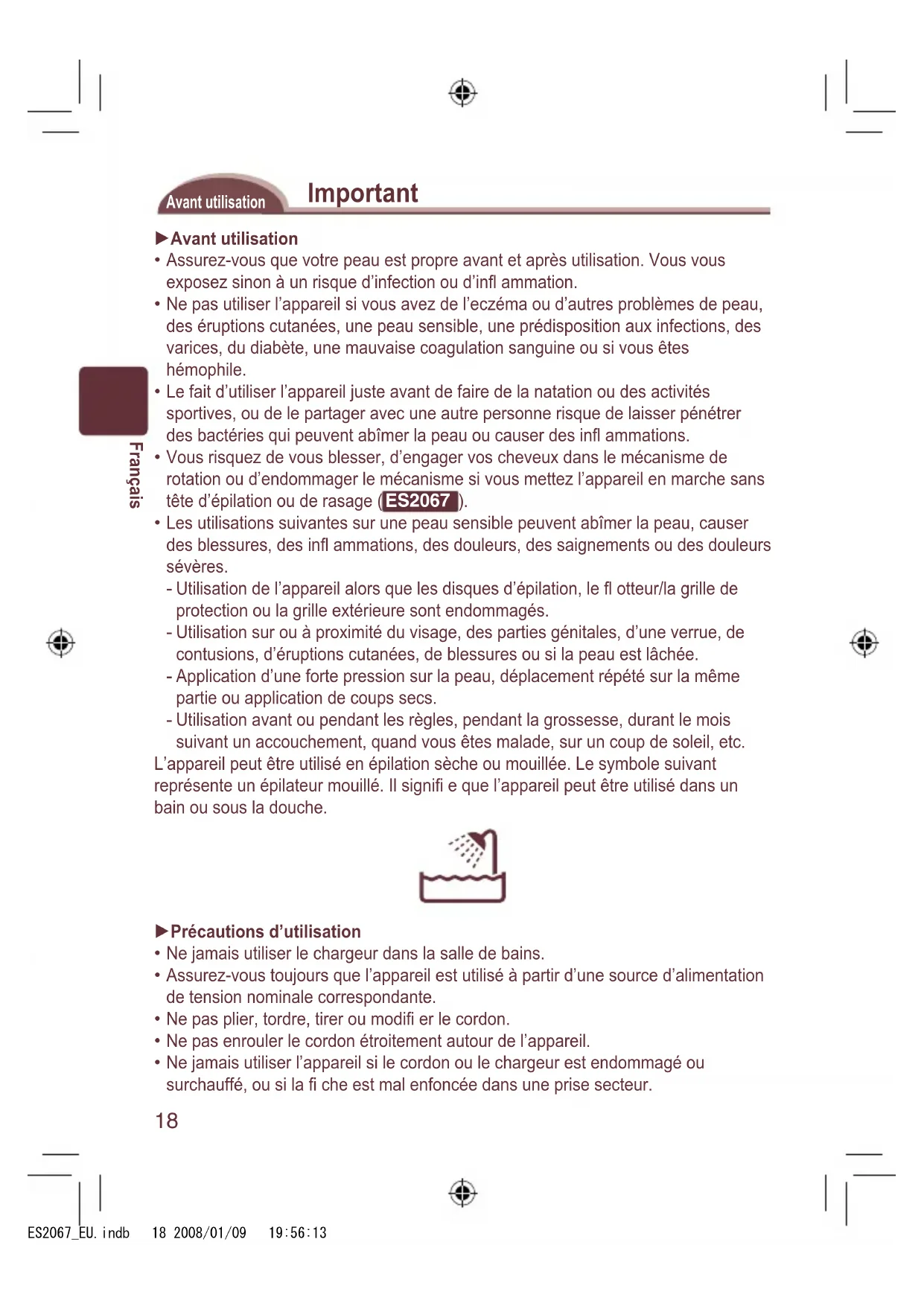 Ablageschale Zubehör: Ladegerät (RE7-46), Reinigungsbürste und Tasche (Verwenden Sie keine anderen Zubehörteile als die mitgelieferten Teile.) ES2067_EU.indb 17 2008/01/09 19:56:1318 Français Important Avant utilisation Avant utilisation Assurez-vous que votre peau est propre avant et après utilisation. Vous vous exposez sinon à un risque d’infection ou d’infl ammation. Ne pas utiliser l’appareil si vous avez de l’eczéma ou d’autres problèmes de peau, des éruptions cutanées, une peau sensible, une prédisposition aux infections, des varices, du diabète, une mauvaise coagulation sanguine ou si vous êtes hémophile. Le fait d’utiliser l’appareil juste avant de faire de la natation ou des activités sportives, ou de le partager avec une autre personne risque de laisser pénétrer des bactéries qui peuvent abîmer la peau ou causer des infl ammations. Vous risquez de vous blesser, d’engager vos cheveux dans le mécanisme de rotation ou d’endommager le mécanisme si vous mettez l’appareil en marche sans tête d’épilation ou de rasage ( ES2067