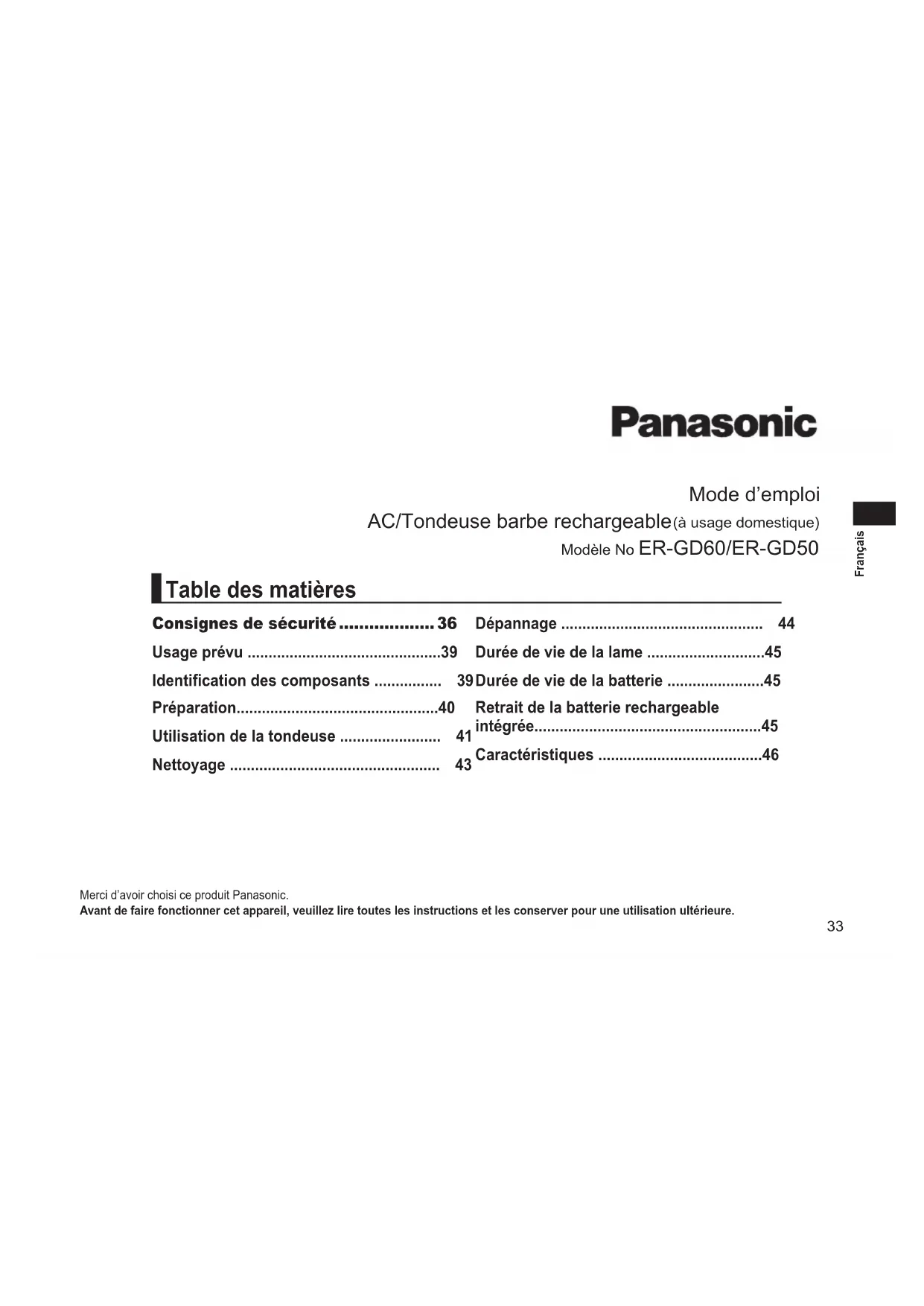 Retrouvez gratuitement la notice de l'appareil ERGD50 PANASONIC au format PDF.