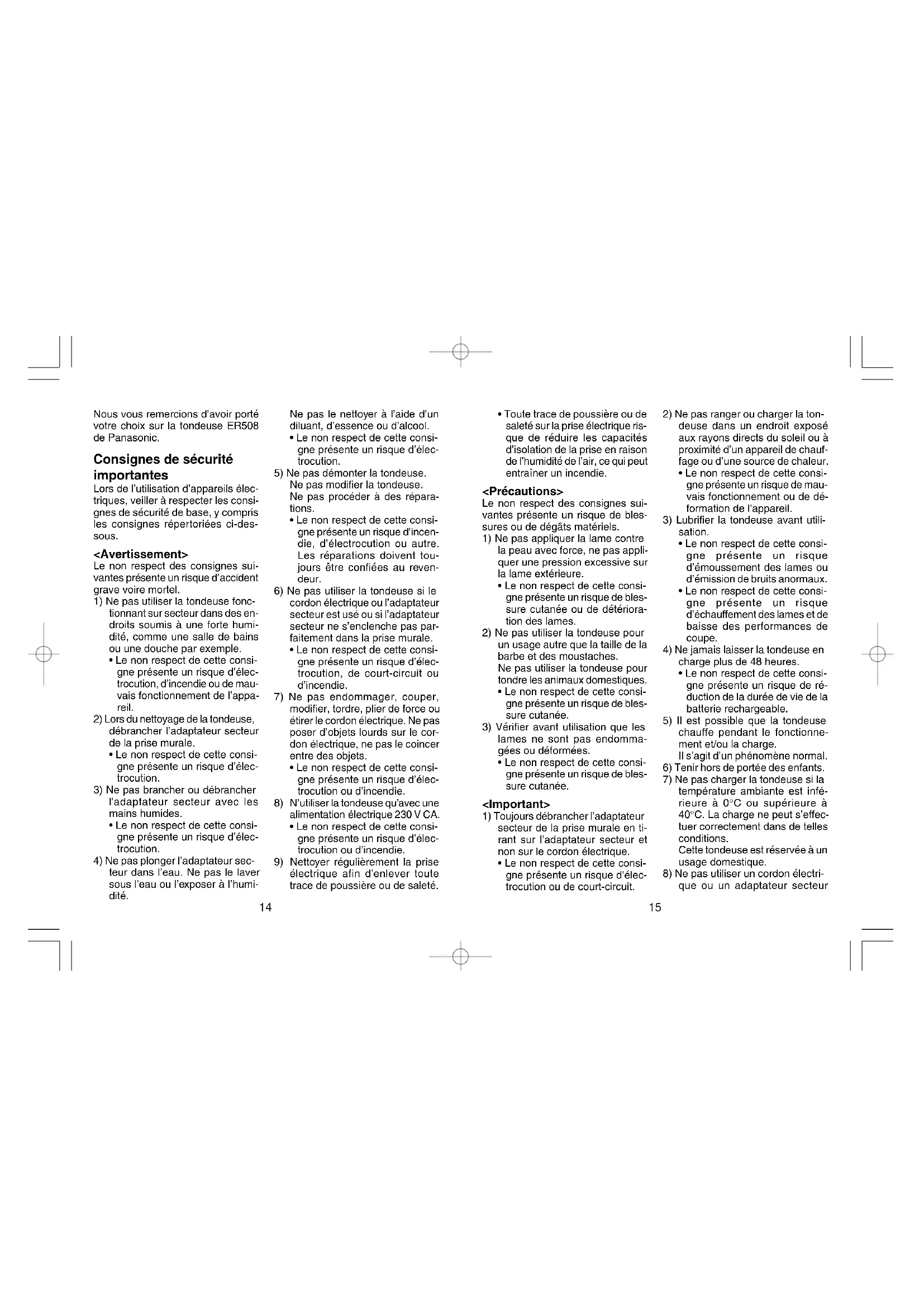 Nous vous remercions d’avoir porté votre choix sur la tondeuse ER508 de Panasonic. Consignes de sécurité importantes Lors de l’utilisation d’appareils élec- triques, veiller à respecter les consi- gnes de sécurité de base, y compris les consignes répertoriées ci-des- sous. <Avertissement> Le non respect des consignes sui- vantes présente un risque d’accident grave voire mortel.