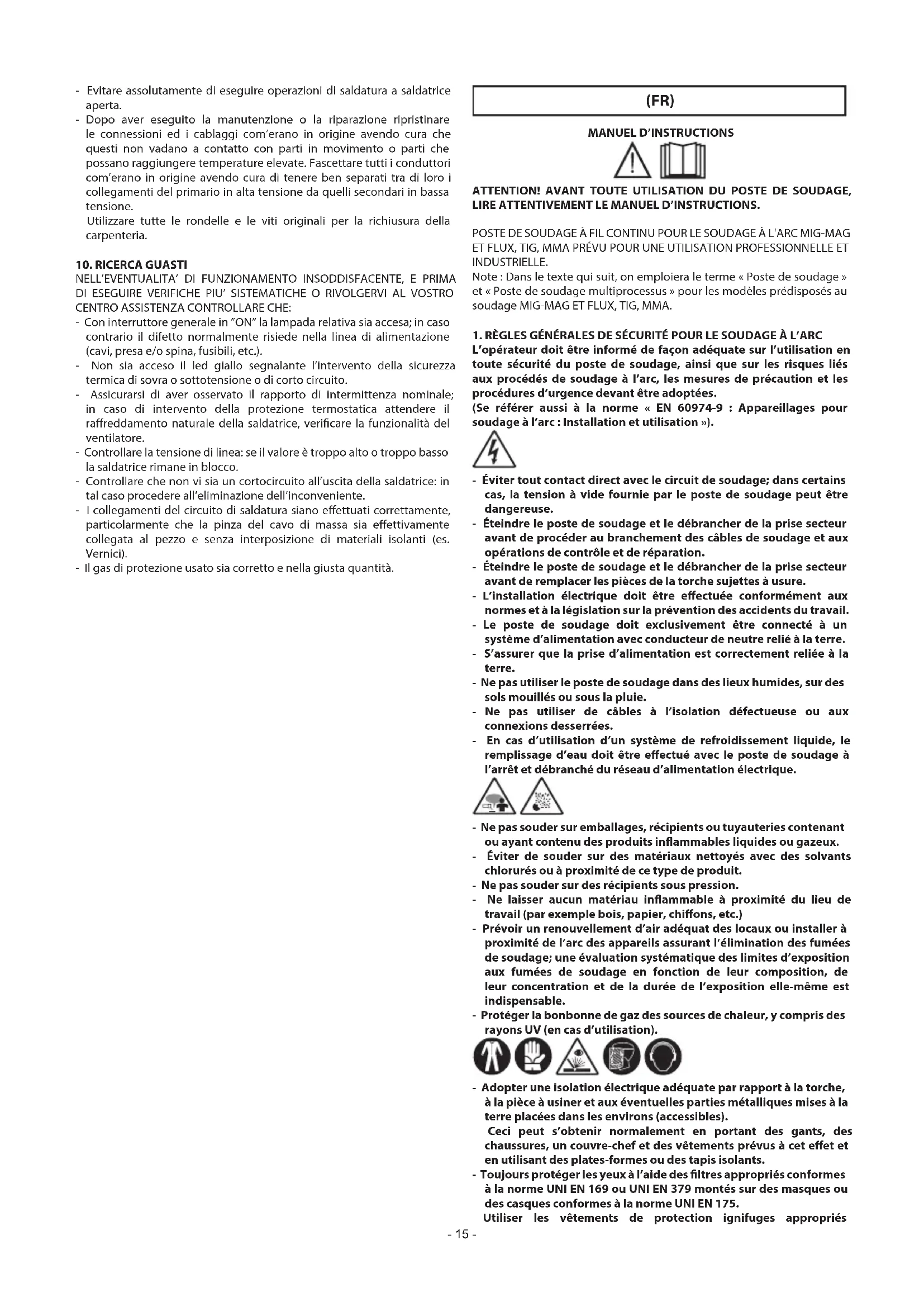 - TOUTE OPÉRATION DE SOUDAGE: - dans des lieux comportant des risques accrus de choc électrique; - dans des lieux fermés; - en présence de matériaux inammables ou comportant des risques d’explosion; DOIT être soumise à l’approbation préalable d’un ”Responsable expert”, et toujours eectuée en présence d’autres personnes formées pour intervenir en cas d’urgence. IL FAUT utiliser les moyens techniques de protection décrits aux points 7.10; A.8; A.10 de la norme «EN 60974-9 : Appareillages pour soudage à l’arc. Partie 9 : Installation et utilisation». - NE JAMAIS procéder au soudage si le poste de soudage ou le dispositif d’alimentation du l est maintenu par l’opérateur (par ex. au moyen de courroies). - Tout soudage par l’opérateur en position surélevée est interdit, sauf en cas d’utilisation de plates-formes de sécurité. - TENSION ENTRE PORTE-ÉLECTRODE OU TORCHES: toute intervention eectuée avec plusieurs postes de soudage sur la même pièce ou sur plusieurs pièces connectées électriquement peut entraîner une accumulation de tension à vide dangereuse entre deux porte-électrode ou torches pouvant atteindre le double de la limite admissible. Il est nécessaire qu’un coordinateur expert exécute le mesurage instrumental pour déterminer s’il existe un risque et s’il peut adopter des mesures de protection adéquates comme l’indique le point 7.9 de la norme « EN 60974-9 : Appareillages pour soudage à l’arc. Partie 9 : Installation et utilisation ».