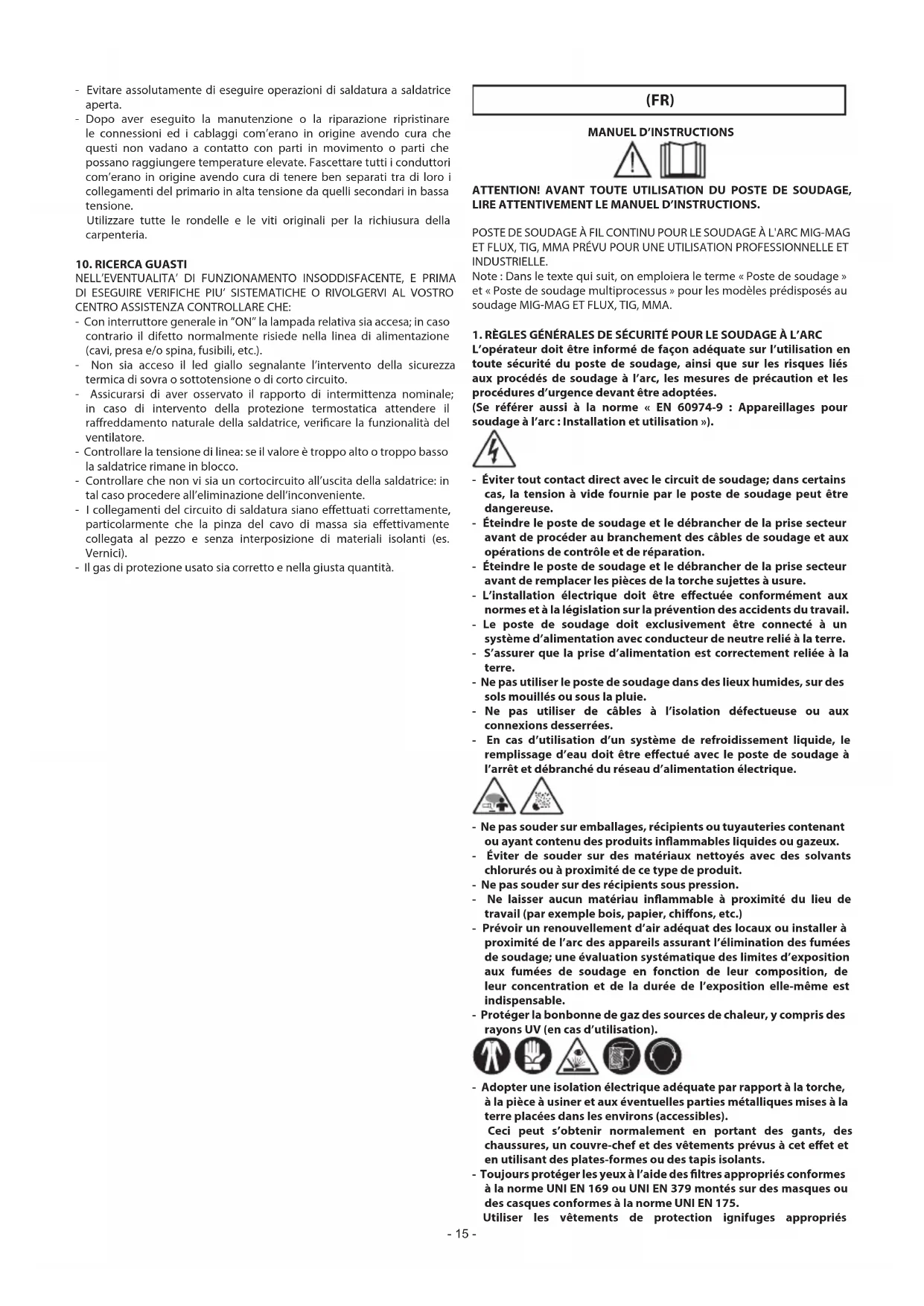 - TOUTE OPÉRATION DE SOUDAGE: - dans des lieux comportant des risques accrus de choc électrique; - dans des lieux fermés; - en présence de matériaux inammables ou comportant des risques d’explosion; DOIT être soumise à l’approbation préalable d’un ”Responsable expert”, et toujours eectuée en présence d’autres personnes formées pour intervenir en cas d’urgence. IL FAUT utiliser les moyens techniques de protection décrits aux points 7.10; A.8; A.10 de la norme «EN 60974-9 : Appareillages pour soudage à l’arc. Partie 9 : Installation et utilisation». - NE JAMAIS procéder au soudage si le poste de soudage ou le dispositif d’alimentation du l est maintenu par l’opérateur (par ex. au moyen de courroies). - Tout soudage par l’opérateur en position surélevée est interdit, sauf en cas d’utilisation de plates-formes de sécurité. - TENSION ENTRE PORTE-ÉLECTRODE OU TORCHES: toute intervention eectuée avec plusieurs postes de soudage sur la même pièce ou sur plusieurs pièces connectées électriquement peut entraîner une accumulation de tension à vide dangereuse entre deux porte-électrode ou torches pouvant atteindre le double de la limite admissible. Il est nécessaire qu’un coordinateur expert exécute le mesurage instrumental pour déterminer s’il existe un risque et s’il peut adopter des mesures de protection adéquates comme l’indique le point 7.9 de la norme « EN 60974-9 : Appareillages pour soudage à l’arc. Partie 9 : Installation et utilisation ».