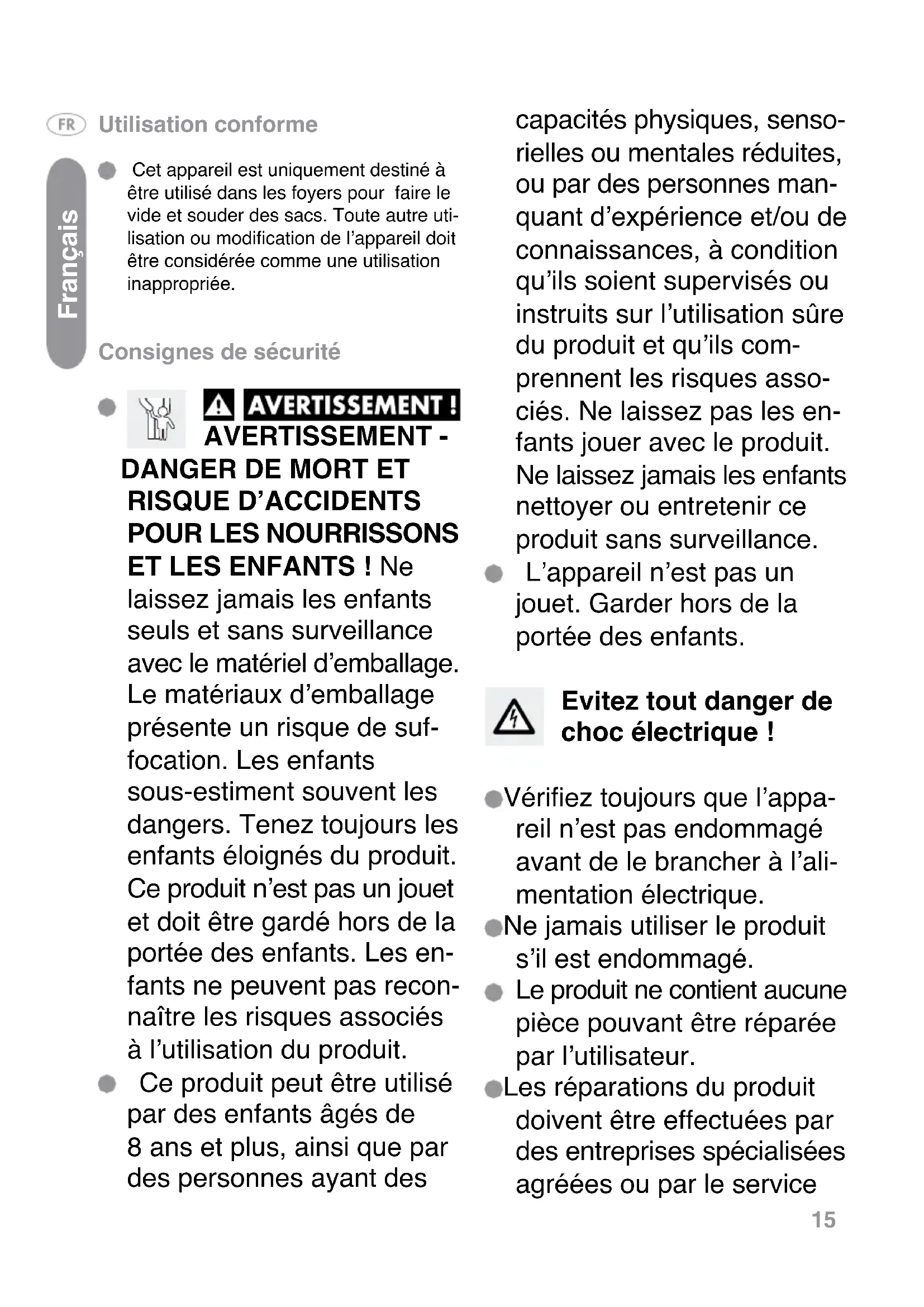 Cet apparéil est uniquement destiné à être utilisé dans les foyers pour faire le vide et souder des sacs. Toute autre utilisation ou modification de l' apparéil doit être considérée comme une utilisation inappropriée.