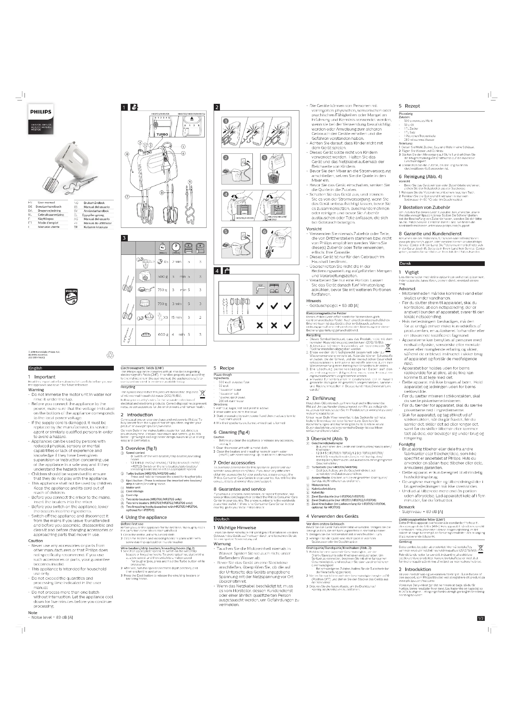- Avant de nettoyer l’appareil ou de retirer un accessoire, débranchez-le. 1 Nettoyez le bloc moteur à l’aide d’un chion humide. 2 Nettoyez les fouets et les crochets à pétrir à l’eau chaude (<60 °C) savonneuse ou au lave-vaisselle. 7 Commande d’accessoires Pour acheter des accessoires pour cet appareil, visitez notre site Web www.philips.com/shop. Si vous rencontrez des problèmes pour vous procurer des accessoires pour votre appareil, contactez le Service Consommateurs Philips de votre pays. Ses coordonnées sont disponibles à l’adresse www.philips.com/support. 8 Garantie et service Si vous rencontrez un problème ou souhaitez obtenir des informations supplémentaires, visitez le site Web Philips à l’adresse www.philips.com/support ou contactez le Service Consommateurs Philips de votre pays. Vous trouverez le numéro de téléphone dans le dépliant de garantie internationale. S’il n’existe pas de Service Consommateurs dans votre pays, renseignez-vous auprès de votre revendeur Philips. Italiano 1 Importante Prima di utilizzare l’apparecchio, leggere attentamente questa brochure che contiene informazioni importanti e conservarla per eventuali riferimenti futuri. Avviso