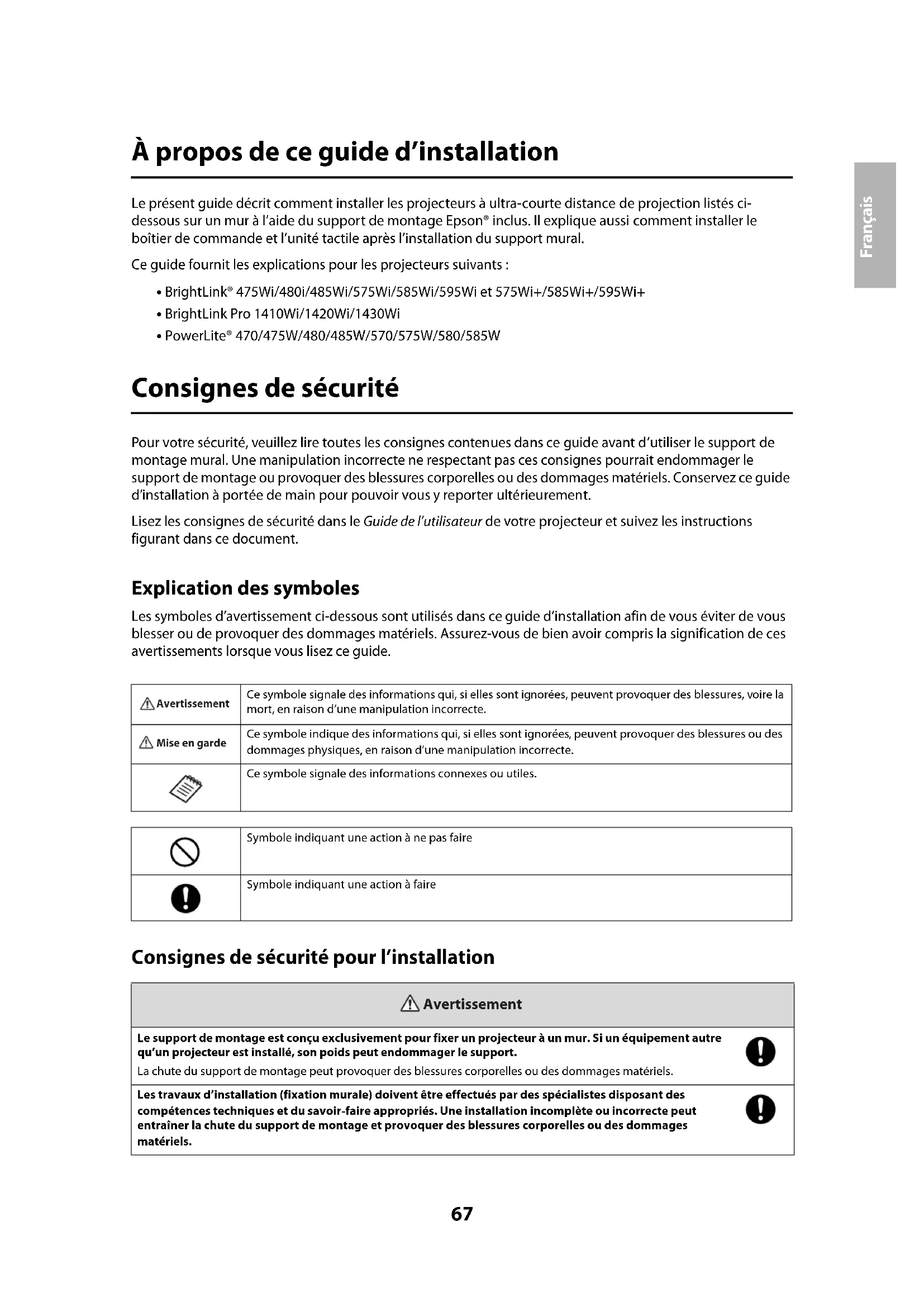 - PowerLite® 470/475W/480/485W/570/575W/580/585W Consignes de sécurité Pour votre sécurité, veuillez lire toutes les consignes contenues dans ce guide avant d’utiliser le support de montage mural. Une manipulation incorrecte ne respectant pas ces consignes pourrait endommager le support de montage ou provoquer des blessures corporelles ou des dommages matériels. Conservez ce guide d’installation à portée de main pour pouvoir vous y reporter ultérieurement. Lisez les consignes de sécurité dans le Guide de l’utilisateur de votre projecteur et suivez les instructions figurant dans ce document. Explication des symboles Les symboles d’avertissement ci-dessous sont utilisés dans ce guide d’installation afin de vous éviter de vous blesser ou de provoquer des dommages matériels. Assurez-vous de bien avoir compris la signification de ces avertissements lorsque vous lisez ce guide. Consignes de sécurité pour l’installation Ce symbole signale des informations qui, si elles sont ignorées, peuvent provoquer des blessures, voire la mort, en raison d’une manipulation incorrecte. Ce symbole indique des informations qui, si elles sont ignorées, peuvent provoquer des blessures ou des dommages physiques, en raison d’une manipulation incorrecte.Ce symbole signale des informations connexes ou utiles. Symbole indiquant une action à ne pas faireSymbole indiquant une action à faireLe support de montage est conçu exclusivement pour fixer un projecteur à un mur. Si un équipement autre qu’un projecteur est installé, son poids peut endommager le support.La chute du support de montage peut provoquer des blessures corporelles ou des dommages matériels.Les travaux d’installation (fixation murale) doivent être effectués par des spécialistes disposant des compétences techniques et du savoir-faire appropriés. Une installation incomplète ou incorrecte peut entraîner la chute du support de montage et provoquer des blessures corporelles ou des dommages matériels.AvertissementMise en garde Avertissement68 Suivez les instructions du présent guide pour installer le support de montage. En cas de non-respect des instructions, le support de montage peut tomber et provoquer des blessures corporelles ou des dommages matériels. Suivez les instructions du présent guide pour installer et utiliser l’unité tactile. Si l’unité tactile n’est pas installée et utilisée de façon appropriée, la lumière émise par le laser pourrait entraîner des lésions oculaires. Manipulez le cordon d’alimentation avec précaution. Une manipulation incorrecte peut provoquer un incendie ou une électrocution. Prenez les précautions suivantes en le manipulant :