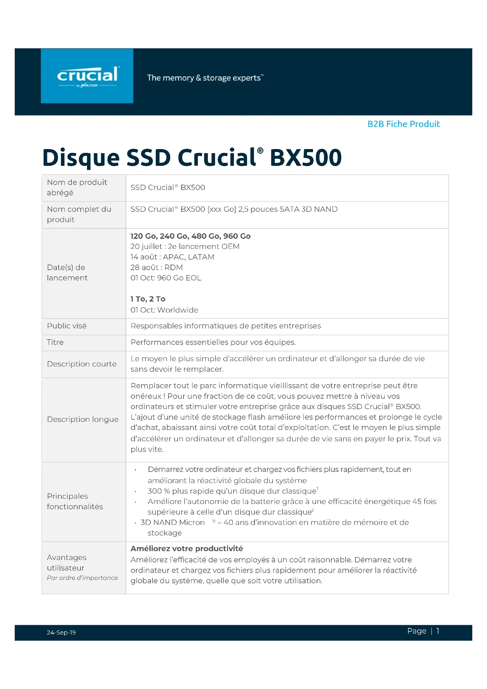 – 40 ans d’innovation en matière de mémoire et de stockage Avantages utilisateur Par ordre d’importance Améliorez votre productivité Améliorez l’efficacité de vos employés à un coût raisonnable. Démarrez votre ordinateur et chargez vos fichiers plus rapidement pour améliorer la réactivité globale du système, quelle que soit votre utilisation.Page | 2 B2B Fiche Produit 24-Sep-19