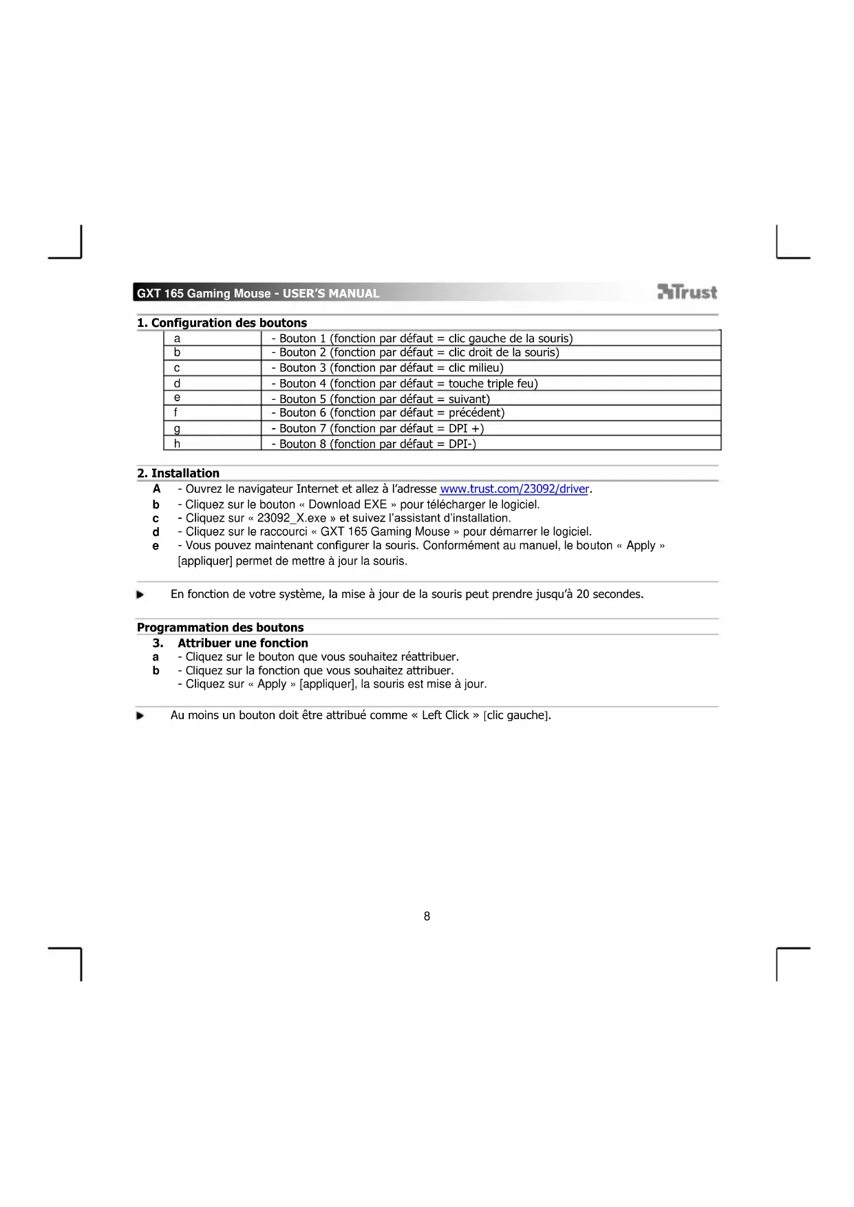 - Ouvrez le navigateur Internet et allez à l’adresse www.trust.com/23092/driver. - Cliquez sur le bouton « Download EXE » pour télécharger le logiciel. - Cliquez sur « 23092_X.exe » et suivez l’assistant d’installation. - Cliquez sur le raccourci « GXT 165 Gaming Mouse » pour démarrer le logiciel. - Vous pouvez maintenant configurer la souris. Conformément au manuel, le bouton « Apply » [appliquer] permet de mettre à jour la souris. En fonction de votre système, la mise à jour de la souris peut prendre jusqu’à 20 secondes. Programmation des boutons